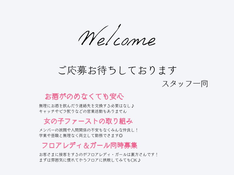 求めている人材 ✨未経験での始めやすさがSiriusのいいところ✨ ほとんどのメンバーが未経験Start☆彡 18歳以上であればどなたでも大歓迎です! =Siriusはどんなお店?= お好きな自分らしい服装でOK~♪ ドレスやヒール、ヘアセットも不要なので 初期費用もかからず安心! 連絡先交換・営業活動・お酒を飲む必要もなし! 普通のバイトに応募するような感覚でご連絡くださいね♪ お友達同士でのご応募もOKです(。-`ω-) 年齢の条件と理由:あり(例外事由2号・18歳以上 (風営法により)) 性別の条件と理由:女性歓迎(ポジティブアクション)