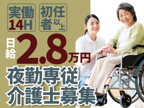 \実働14時間勤務で日給2万8000円/夜勤2名体制|週2回~相談OK|夜間は雑務ほぼ無し|車通勤可