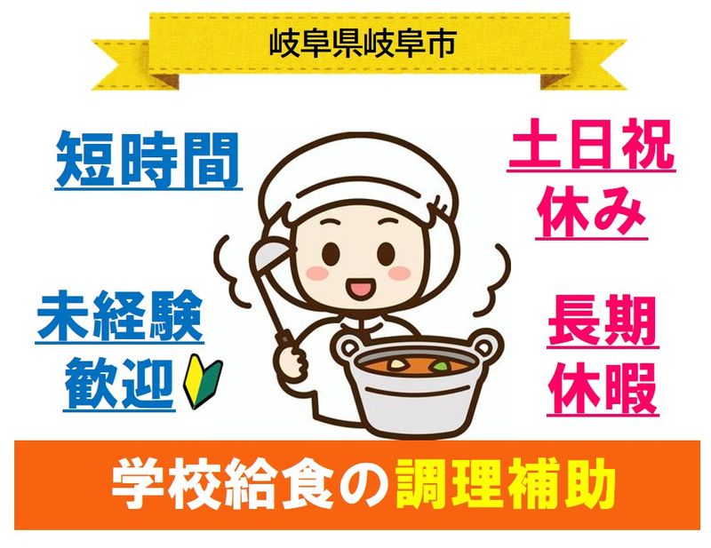 メッセージ 嬉しい食事補助付き◎学校給食補助 ■平日15時まで♪ 15時からの時間はしっかり確保! 買い物や、お子様のお迎えなど 時間を有効的に使えます◎ ■土日祝休み&長期連休あり! 小学校と同じ、夏休み・冬休み・春休みがあり お子様との時間も大切にできます♪ また基本的には週5日勤務ですが お子様の急な体調不良や行事など お休みは柔軟に対応します。 ◇POINT◇ ◎空調完備のキレイな環境 ◎交通費支給 ◎短時間ワーク ◎長期休暇あり ◎休憩室あり ◎職場内禁煙 \岐阜市内中学校/ 経験・資格は一切要りません! 15時までの短時間勤務◎ 未経験歓迎◎ 労働者派遣事業((派)21-300135) 職業紹介事業(21-ユ-010036)