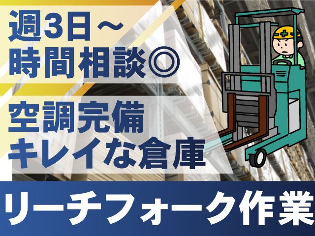 【勤務時間相談OK】リーチフォーク作業 空調完備・キレイな休憩スペース完備・車通勤OK