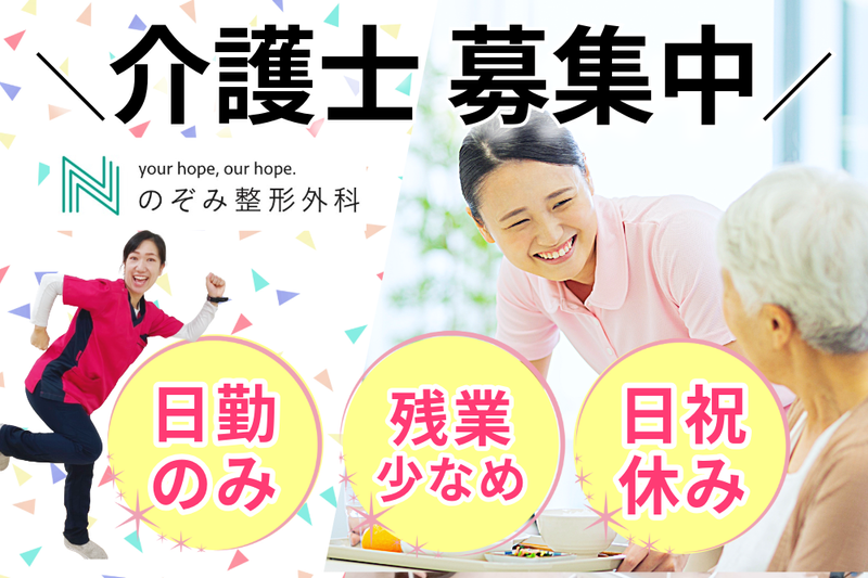 仕事内容 ◆ “ここなら続けられる” を感じられる職場です。 ┏━━━━━━━━━━━━━━━━━━━━━━━┓ 経験があれば無資格でも応募OK! ブランク明け・子育て中・扶養内で働きたい方、大歓迎です。 ✅副業・WワークOK ✅家庭都合のお休みに柔軟対応 ✅同年代スタッフが多く働きやすい ✅評価が見えるキャリアパスで頑張りは給与へ反映 情報収集だけの問い合わせもOK!見学だけでも大歓迎 「介護の仕事は好き。でも働き方は無理したくない」 そんな方にピッタリです。 通所リハ(デイケア)未経験の方歓迎 のぞみ整形外科で新たなキャリアを描きませんか? ┗━━━━━━━━━━━━━━━━━━━━━━━┛ ご興味ある方はぜひお気軽にお問合せください♪ ―――――――――――――――――――― 電話:082-264-1700(担当:カネヤマ宛) 受付時間:9:00〜18:00 ―――――――――――――――――――― ■仕事内容 通所リハビリテーションにて、利用者さんの 「できること」を増やすサポートを行います。 <主な業務> リハビリ指導・見守り 送迎業務(西条・八本松・志和方面)※車種:ステップワゴン 入浴介助 配膳など日常サポート ※リハビリ指導が初めてでも、 丁寧にサポートするので安心してスタートできます! ☆-☆-☆-☆ ◆働く仲間も多く、常時協力体制をとれる環境 常勤5名 非常勤7名 平均年齢44.9歳 経験豊かな先輩や完全未経験スタートのスタッフが幅広く活躍中! ◆子育てと両立しやすい職場 お子様の学校行事や急病などによるお休みも相談に応じます。 「子育てしながらキャリアを築きたい」そんな方も歓迎です! ◆キャリアパス制度 分かりやすい評価で給与UP 日々の頑張りを適正・公平に評価するよう心がけております! ◆その他 髪の色、アクセサリー、ネイルなどは規定の範囲内で自由にしていただけます。 規定については面接時などにお気軽にご質問ください。 ☆-☆-☆-☆ 【概要】 法人名:医療法人社団 伯瑛会 設立年月:2004年6月 URL:https://www.nozomi-clinic.jp/ のぞむ、のぞみ。 患者さんの希望が私たちの願い。 笑顔で寄り添い、治し、 鍛え、診続け、備える。 私たちが守りたいのは、 地域の”からだ”の健康と 暮らす方々が望むライフスタイル。 患者さんの人生に、心を揃え、 まっすぐ向き合い続けます。