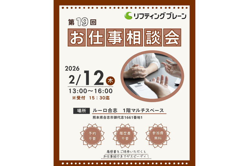 ■職種 検査業務 ■勤務形態 固定労働時間制 ■先輩からのメッセージ ________________ 巨木の精神(こころ)で 人と企業をつなぐ会社でありたい。 語りあおうあなたの未来 ________________ 株式会社リフティングブレーンは、 創立30年以上の地場企業です。 人と企業の架け橋として、 双方のより良い未来に向けてサポートをしております。 製造・事務・販売などのご希望職種はもちろん、 ✅短時間(扶養内で働きたい) ✅フルタイム(正社員を目指したい) ✅オープニング案件 ✅平日のみ ✅土日メイン などお気軽にご相談ください。 設立:平成3年(1991年)3月 事業内容: 人材派遣サービス (人材派遣、紹介予定派遣) 人材紹介サービス(社員紹介、転職支援) BPOサービス (業務プロセスアウトソーシング) 本社:熊本県熊本市 営業拠点:熊本、福岡、鳥取 ※原稿内で動画が見られない場合は 「リフティングブレーン」と検索いただければ 当社SNS(Instagram・YouTube)でも閲覧可能です! ■雇用期間の定め 定めあり(派遣労働契約) ■契約期間 長期 ■URL https://www.liftin.jp/ ■求人ナンバー 10141_in_SS ■その他の求人詳細情報 リフティングブレーンは 単なる転職サポートではなく、 あなたにとって良いご縁をお繋ぎする パートナーを目指しています。 / 自分らしいキャリアアップのために 長く安定して働くために お仕事の悩み、なんでもご相談ください \ ✨WEBで簡単面談予約! ✨面接~入社まで最短1週間可能 ✨熊本地場・有名企業取引多数 ✨スキルチェックや転職相談のみOK ✨自社にて職業訓練校も開講中! 【2026年3月末まで限定|お友達紹介キャンペーン開催中】 最大1万5000円をご紹介者・ご友人にプレゼントいたします! ❶ご友人の登録時:5000円分のQUOカード(通常時より金額UP中!) ❷ご友人の勤務開始時:10,000円の現金支給 ※詳細規程がございますので対象となるか、まずはお問合せください ■更新日 2026年01月27日