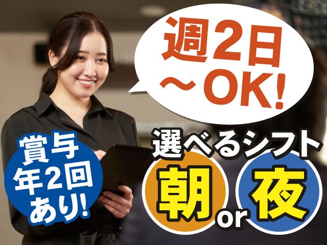仕事内容 \研修終了後に入社お祝い金支給!/ あなたの笑顔がホテルレストランの「顔」になります! ホテルと共に成長し、温かい空間を創りませんか。 ホールアルバイト・パートさん募集! 美味しいと人気のホテルレストランで、私たちと一緒に働きませんか。 プライベートとの両立もしやすい選べるシフトがポイント 週2日~OK!朝勤または夕勤が選べます! \ ここがポイント / 【時間】朝勤・夕勤のどちらか選べます! 【勤務】週2日~OK!学生バイトさんにもおススメ! 【賞与】アルバイト・パートさんにも賞与支給! <ホールの仕事内容> ホテルレストランでのホール業務をお任せします。 お客様のご案内と料理提供(配膳)がメインのお仕事です。 ・レストランホールでの配膳・接客業務 ・ホールのセッティング ・簡単な調理補助(盛り付けなど) ・洗い場の補助(食器洗いなど) その他、ホールの簡単な清掃作業なども行います。 ◆配膳について ホテルレストランは、事前に予約されていることがほとんど。 ホール係は予約内容を確認しながら、料理をお出ししていきます。 オーダー取りやお会計業務がないので、配膳に集中しやすいのもポイント! ◆お会計業務ナシ ホテルレストランなので、会計業務はありません。 金銭の取り扱いがないので、業務負担が軽減! 集中してホールの仕事を覚えられる環境です。 \ 入社後は研修1ヶ月あり / まずは1ヶ月の研修で仕事を覚えられます。 分からないことは先輩スタッフにどんどん質問してください! 配膳マナー、接客について、料理についてなど、丁寧にお教えします。 高校生・大学生・専門学生など学生バイトさんもOK! 《 研修終了後、入社祝金5,000円支給!! 》 \ 働ける時間が限られている方へ / 当レストランで働くアルバイト・パートさんは、シフトの選択が可能! ・ディナー対応が中心の夕方勤務 ・モーニング対応が中心の早朝勤務 どちらかだけでも、両方でもOK! ライフスタイルに合わせてお選びください。 夕勤(17時~)シフト固定でも働けるので安心。 アルバイトでお小遣い稼ぎと社会人経験を積めて一石二鳥 \ちょっとだけ働きたい方にも!/ 週2日からOK!Wワーク・副業にも最適! 「少しだけ働きたい」「お小遣い稼ぎ程度に」 という方にもおススメのアルバイト・パートのお仕事です。 学生バイトさんなら、放課後の時間を有効活用できちゃいますよ