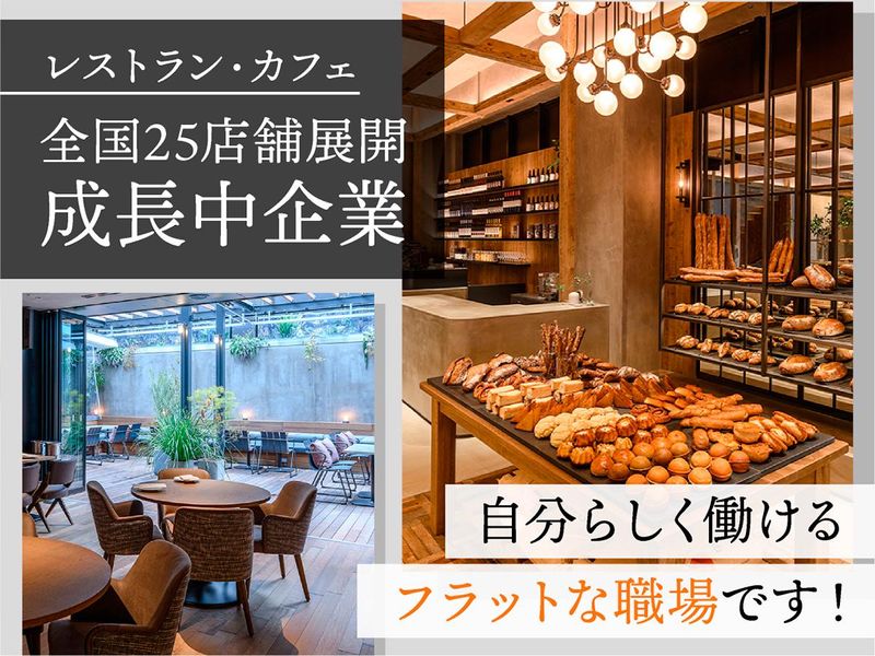 職場環境 全国で約25店舗のレストランや カフェを展開する企業です。 社内はフラットで風通しが良く、 意見を伝えやすい開かれた雰囲気。 挑戦を後押しする文化があり、 仲間と支え合いながら のびのび働ける環境です!