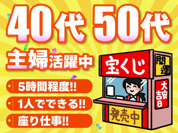 仕事内容 お客様に夢を与える! 宝くじ売り場の窓口スタッフです。 笑顔でご対応を願いします♪ 簡単なお仕事なので安心してくださいね。 【注目ポイント!!】 ★研修が充実★ OJT研修がある他、マニュアルも完備◎ お仕事に慣れたら、1人でゆったりと働けますよ! ★快適な職場環境(体力の心配なし)★ 座り仕事で無理なく働けますよ◎ ★自分時間も大切にできる★ シフトは早番と遅番で分担していただきます! 基本的に決まった時間での勤務の為、 ご家族との時間も確保できますよ◎ ・・・・◆実際に働くスタッフの声◆・・・・ <40代女性スタッフ> 家族と過ごす時間も大事にしたいので、 フルタイムではないこの仕事の時間帯に魅力を感じました☆ 忙しい時もありますが、 困ったことは上司や先輩に相談すれば即座に対応して頂け安心です! <50代女性スタッフ> 働く中でお客様から感謝の言葉を頂けると嬉しく思います☆ 週3~4日勤務で勤務時間も4~5時間程度なので 自分の時間が取れ、子供の学校行事にも参加できます! <50代女性スタッフ> この仕事は覚えることがたくさんありますが、 お客様から「当選したよありがとう!」 と言って頂けると嬉しくてたまりません♪ いつも笑顔で明るい仲間と楽しく働いています! <40代女性スタッフ> 入社前から宝くじを購入していて、 自分もこんな風に宝くじで夢を届けたいと思い応募したのがきっかけです。 実際に働いていると「当たった!」と報告してくれる方もいて嬉しいです☆ このように、子育てが落ち着いた 40代・50代の同世代の主婦スタッフばかりで働きやすい職場です!