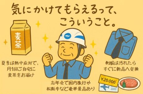 【保険制度】 雇用保険、労災保険、健康保険、厚生年金 待遇・福利厚生 【福利厚生】 ◆◇◆ 福利厚生・待遇 ◆◇◆ ◎ 交通費規定支給 ◎ 残業代全額支給・各種手当あり ◎ 社会保険完備(法令による) ◎ 資格取得支援制度(費用は全額会社負担) ◎ 有給休暇・介護休業制度あり ◎ 制服貸与(夏は空調服・冬は防寒着) ◎ 入社祝い金最大10万円支給(支給条件あり) ◎ 法定研修あり(4日間・合計30時間/研修費3万4400円支給) ◎健康診断 ◎公的資格取得支援 ◎社員登用あり ◎バイク通勤OK ◎車通勤OK