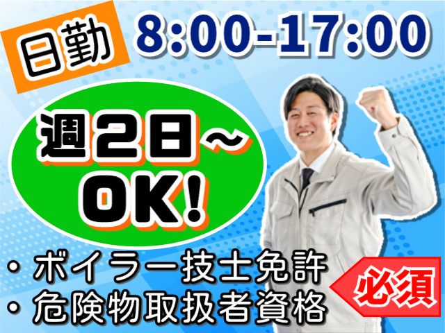 仕事内容 公共施設の設備管理スタッフ パート・アルバイト求人募集! 週2日~OK!日勤帯なので体に無理なく働けます。 ※ボイラー技士免許・危険物取扱者資格 必須 <注目ポイント> 〇資格・経験活かせる! 〇日勤 〇週2日~OK 〇与野本町駅より徒歩7分 〇中高年・シニア活躍中 〇扶養内勤務可 【仕事内容】 さいたま市中央区下落合にある公共施設の 設備管理及び受付業務等のお仕事です。 ※ボイラー技士免許・危険物取扱者資格 必須 <具体的には…> 〇ボイラー運転業務 ・浴場湯温度管理 ・塩素自動注入機、ろ過機の管理 ・重油残量管理 ・浴場関係機械類の点検等 〇受付業務 ・利用者来館時の受付 〇その他 ・電灯管球の交換 ・照明器具清掃 ・池の管理 ・その他 職員からの依頼 など 施設管理・設備管理の経験がある方はスキルが活かせます! 先輩スタッフが丁寧にお教えしますのでご安心ください。 【勤務について】 時間/8:00~17:00(実働8時間・休憩1時間) 勤務/週2日~3日 中高年・シニア世代の方、ブランクがある方も大歓迎! 日勤の時間帯なので体に無理なく働けます。 【こんな経験活かせます!】 下記経験者は前職活かせます 〇施設管理アルバイト・パート 〇ビル設備管理アルバイト・パート 〇ビルメンテナンスアルバイト・パート 〇施設警備アルバイト ハローワークでお仕事をお探しの方にもおススメ! ご応募お待ちしております。 まずはお気軽お問い合わせください! TEL.048-647-3800
