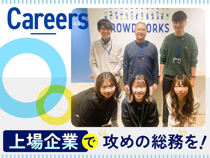 仕事内容 上場企業の安定基盤×組織をつくる手応え。 総務スペシャリストとして次のステージへ。 ━━━━━━━━━━━━━━━━━━━━ 2011年、『個のためのインフラになる』を スローガンに掲げ、設立した当社。 日本最大級のクラウドソーシングサービス 『クラウドワークス』を展開し、 2014年には東証マザーズ上場 (現グロース)を果たしました。 現在は300名規模へ拡大。 安定基盤を持ちながら、成長市場にも携われる環境です。 今回は、「総務リーダー候補」の募集です。 単なる庶務に留まらず、 「ファシリティ管理」や「グループ総務対応」や「BCP策定」など、 組織基盤を強化する”攻めの総務”をお任せします。 「意志を持って取り組む」という カルチャーマインドのもとで 活発な意見交換を大事にしている当社では、 リーダーシップを発揮する方を応援、歓迎する風土があります。 「マネジメント領域へ踏み込みたい」 という想いにもお応えできる環境があり、 将来的には組織の舵取りを担う存在として 最前線で活躍していただけます。 柔軟な働き方を叶えつつ、 総務のプロフェッショナルとして新たなキャリアを築きませんか? ━━━━━━━━━━━━ | 仕事内容 | ━━━━━━━━━━━━ 子会社を含むファシリティ運営をはじめ、 会社資産の管理、オフィス環境の維持・管理、商事法務など、 総務業務全般を担当していただきます。 入社後は、これまでのご経験や得意分野を考慮し、 対応可能な業務から段階的にお任せします。 < 具体的には… > ■オフィス戦略・環境最適化 ・ファシリティ管理 ・オフィス環境維持管理 ・固定資産を含む会社資産の管理・運営 ■商事法務業務 ・株主総会の運営補助 ・取締役会の事務局対応 ・登記業務 ■企業リスク・安全管理体制の構築 ・BCP推進を含むリスクマネジメント活動の企画・運用 ・防火防災管理 ■組織活性化・業務プロセス改善 ・グループ会社マネジメント ・庶務業務全般の改善提案、実務 ・他部署との調整、折衝業務 など ・社内イベントの運営支援 ・規程管理・安全管理業務 ◎リーダー候補として、裁量を持って企画・実行できる環境です。 ◎ファシリティ管理や商事法務、BCPなど、企業価値を守り高める専門性が身につきます。 ◎円滑なコミュニケーション・効率的な働き方を目指しています。 ━━━━━━━━━━━━━━━ | ココがPOINT! | ━━━━━━━━━━━━━━━ 【1】何でも聞ける仲間がいます  ̄ ̄ ̄ ̄ ̄ ̄ ̄ ̄ ̄ ̄ ̄ ̄ ̄ ̄ ̄ ̄ それぞれで業務を進めるのではなく、 日々、社員同士でコミュニケーションを とってお互いの進捗管理をしています。 困ったことがあれば皆で解決する チームワークの良さが自慢のひとつです! 【2】能力を正当に評価します  ̄ ̄ ̄ ̄ ̄ ̄ ̄ ̄ ̄ ̄ ̄ ̄ ̄ ̄ ̄ 半期ごとに目標を立て、 達成度合いで評価を実施します。 昇給チャンスは年2回。 あなたの頑張りはきちんと評価し、 給与に反映いたします。 【3】フルフレックス制度  ̄ ̄ ̄ ̄ ̄ ̄ ̄ ̄ ̄ ̄ ̄ ̄ ̄ 月末月初は忙しくなりますが、 繁忙期明けにフレックスを利用して、 15時に上がるなどメリハリをつけて働けます! 【4】新オフィス&リモートOK  ̄ ̄ ̄ ̄ ̄ ̄ ̄ ̄ ̄ ̄ ̄ ̄ ̄ ̄ ̄ 事業拡大と働きやすさの柔軟性を目指し、 2025年11月より新オフィスに移転! リモートワークの活用も可能で、 社員にとってつねに快適な環境とはなにか を探求し続け、時代に合った働きやすさの 基盤づくりに注力しています。