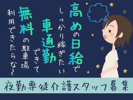 仕事内容 ■住宅型有料老人ホームにおける介護業務全般 【生活介護】 ・食事の準備、部屋の掃除 ・身の回りの整理整頓 ・朝食時の食堂への誘導 ・利用者様の話し相手 【身体介護】 ・食事介助、排泄介助、配薬 【その他】 ・施設内での夜間見守りサービス ・介護記録作成(スマートフォンを使用) <派遣先> 全49室住宅型有料老人ホーム <通勤方法・その他補足> ※車通勤可能!無料駐車場完備 <新型コロナウイルス感染防止対策実施> マスク着用での勤務、アルコール消毒液完備などの感染対策をし、利用者様もスタッフも守れるよう体制を整えています。 <受動喫煙対策> あり(屋内禁煙) ここがポイント ■日給2万7000~2万8500円!月収28万円以上可能◎ ■全49室住宅型有料老人ホームでのお仕事です ■17:00~翌9:00(実働15時間)勤務 ■週2回勤務よりご相談ください ■介護記録は、スマートフォンを使用 ■交通費全額支給 ■ライフスタイルに合わせて趣味も楽しみながら働けます ■車通勤可能!無料駐車場完備