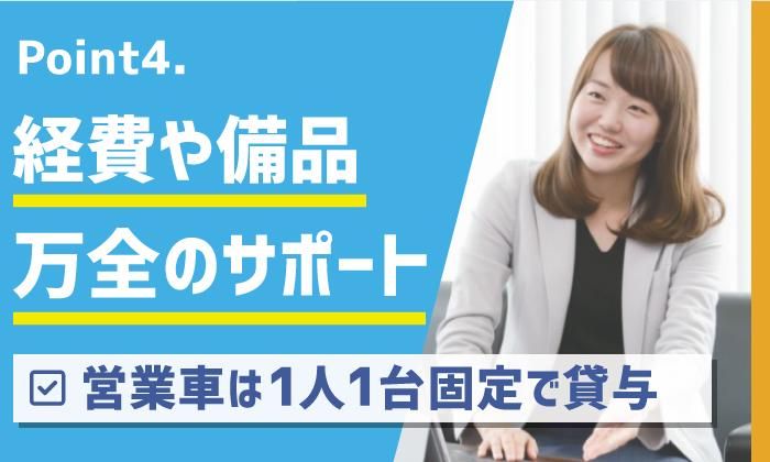 【保険制度】 雇用保険、労災保険、健康保険、厚生年金 待遇・福利厚生 【福利厚生】 ・昇給年1回 ・賞与年2回 ・産休育休制度 ✅仕事に必要な経費は会社負担! (スマホ・PC・プリンター貸与) ✅営業車一人一台固定で貸与 (直行直帰のため通勤利用可) ✅自宅付近の駐車場もご用意 ✅在宅・リモート勤務OK!