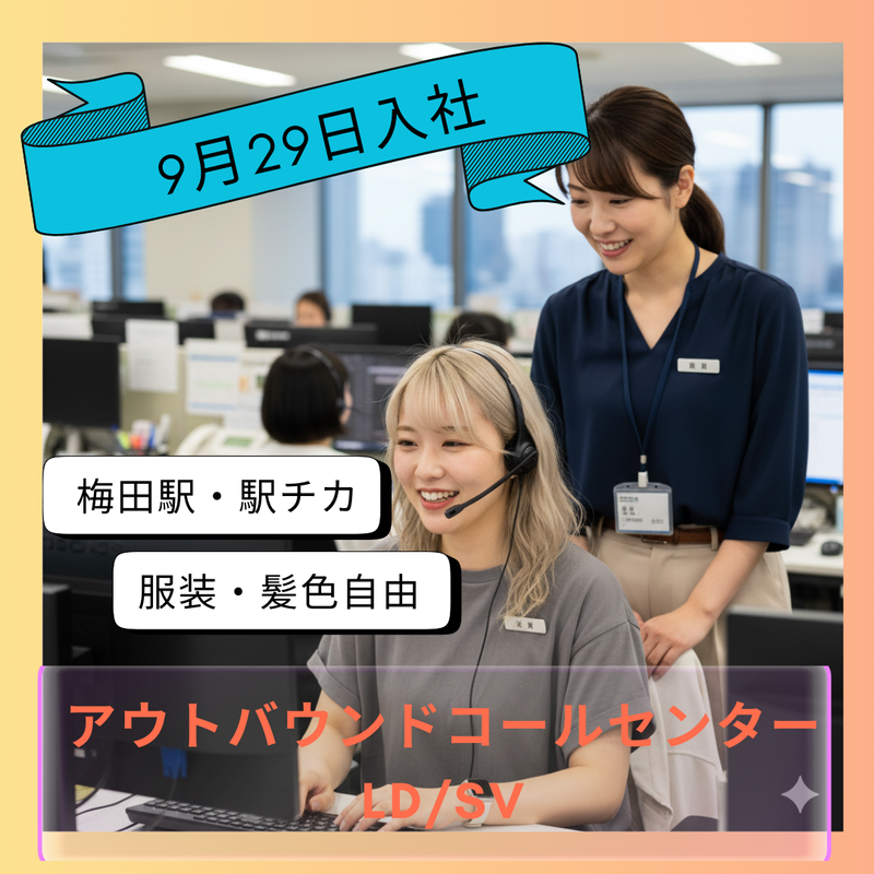 仕事内容 「発信経験を活かして、次のステップへ」 資料請求済みのお客様へのご案内業務で、 チームを支える管理者ポジションを募集! 【おすすめポイント】 ★アウトバウンド: 資料請求済のお客様へのご案内で話しやすい ★キャリアアップのチャンス: LD業務は初めてでもサポート体制あり ★駅チカ: 梅田駅・大阪駅から徒歩すぐの好立地 ★高時給: 時給1,500円以上も可能! ★服装自由: 服装・髪色・ネイルも自由にOK 【仕事内容】 webから資料請求をされたお客様へ、 来院のご案内を行う発信業務のチームで、 SV・LD(リーダー)として ご活躍いただきます。 【主な業務内容】 ・資料請求者への発信(予約のご案内) ・メンバーの進捗確認・サポート対応 ・実績の集計 ・社内外との情報共有や報告業務 【応募資格】 ・発信業務の経験がある方 ・簡単なExcel操作ができる方(入力・集計等) ・コールセンターや営業などでの リーダー経験がある方歓迎◎ 【給与】 時給:(LD)1,400円~ (SV)1,500円~ ※交通費支給(上限15,000円/月) 【給与例】 (LD) ・週5日 × 8時間勤務 → 月収例:246,400円 ※勤務日数や時間により変動します (SV) ・週5日 × 8時間勤務 → 月収例:264,400円 ※勤務日数や時間により変動します 【勤務時間・日数】 ・9:00~18:00(実働8時間・休憩60分) ・土日祝含むシフト制 ・フルタイム×週5日勤務のみの募集です 【勤務地】 大阪府大阪市北区梅田1-11-4 大阪駅前第4ビル 16階 (各線「梅田駅」「大阪駅」より徒歩すぐ) ◆待遇・福利厚生 ・交通費支給(上限15,000円/月) ・社会保険完備(法令に準ずる) ・服装・髪型・髪色・ネイル自由 ・休憩室・自販機あり ・研修あり(OJT含む) ◆勤務開始日 ・2025年9月29日(月)入社予定