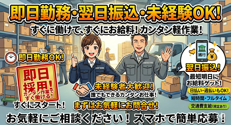 求めている人材 <<未経験、副業・Wワーカー大歓迎>> 未経験で活躍しているスタッフ多数! 力仕事ではなく、職人さんのサポート軽作業が中心。 ▼こんな方におすすめ ・単発スポットで働きたい ・ちょっと隙間で働きたい ・翌日にはお金が欲しい ・本業と両立しやすい副業をしたい ・急遽予定が空いたときに働きたい 10~70代の方活躍中! 年齢に合わせて行く現場を変えるので どんな年代の方も活躍できます! ━━━━━━━━━━━━━━━━━ <20代スタッフの声> 「飽きっぽい自分でも続けられる!日払いですぐ稼げるのが最高!」 以前は飲食店やイベントの単発バイトを転々としていました。 この仕事を選んだのは「週1〜OK」と「日払い」があったからです。 難しい作業は本当にありません。 何より、働いた分がすぐにお金になるのはモチベーション維持に直結しますね。 急な出費や、週末に遊びたい時も安心です。 人間関係も変に干渉し合わないサッパリした雰囲気で、自分のペースで働きたい人にはピッタリだと思います! ━━━━━━━━━━━━━━━━━
