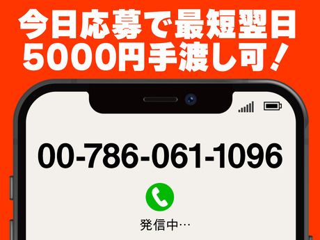 選考プロセス 電話応募で、その場で研修日時のご予約ができます。 あっという間にお仕事決定♪ ▼ご応募はこちらから▼ 【00-786-061-096】 【問合せ先について】 問合せ先:0078-606-1096 <TEL受付時間>平日9:00~17:00、それ以外の時間帯はWEBにて24時間受付中! 応募方法 ▼ご応募はこちらから▼ 【00-786-061-096】 面接なし!来社なし!電話1本で完結! 簡単な確認のみで即内定! 自宅にいながら内定GET&履歴書不要!