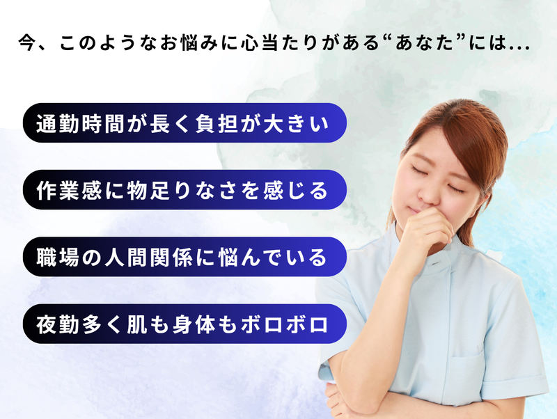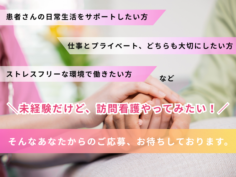 求めている人材 ■必須条件 ・正・准看護師資格 ・採血、点滴、注入、バルーンカテーテルの管理・挿入(男性の対応をしたことがなくても、導尿したことあればOK)導尿、創傷の処置・管理、褥瘡処置・管理の経験 ■歓迎条件 ・訪問看護経験者 ・麻薬の管理ができる ■こんなあなたなら活躍できます! ・「あなただけにいつもつい本音が漏れてしまう」と言われる聞き上手な方 ・「気づきが早い」「報告が丁寧」と言われ周りから安心されやすい方 ・指示通りに動くだけではなく、自分の判断や気づきで貢献したいと感じている方 ・「また来てくれて嬉しい」と笑顔で迎えられる看護師になりたい方