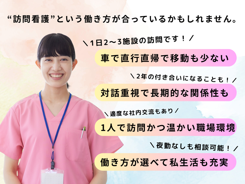 仕事内容 求人ポイント ==================== ✅月給35万円~+賞与年2回 ✅年間休日120日以上/副業もOK◎ ✅訪問エリアは貝塚市の近隣のみ ✅訪看未経験歓迎!1か月の同行研修あり ✅車で直行直帰&現在は1施設のみ訪問 ✅残業ほぼゼロで夜勤なしも相談可能♪ ==================== 「今日も来てくれて嬉しいわ、いつもありがとう」 そんな言葉をいただけるのが、訪問看護の魅力です。 《業務内容》 病棟勤務で感じていた“作業感”に、モヤモヤしていませんか? 訪問看護では、一人ひとりの生活に寄り添いながら、長期的な信頼関係を築けます。 業務内容は、患者さんとの対話や健康管理がメインです。 医療処置は、バイタルチェック/点滴/カテーテル管理などが中心です。 《訪問先》 訪問していただくのは、在宅ではなく、【施設】がメインです。 また、場所も【貝塚市】の近隣エリアのみです。 現在の訪問先: 有料老人ホーム1施設 (大阪府貝塚市久保2丁目34番1、34番3、34番4) ※今後、訪問先が増える可能性がありますが、 その場合でも1日2〜3施設までとし、 無理のないスケジュールを組みます。 ◆ 未経験でも安心のサポート体制 ・1ヶ月間の同行研修あり ・マニュアル完備&定期勉強会あり ・看護技術の確認やオンコール対応も、丁寧にレクチャー 「自分も未経験から始めたからこそ、気持ちがわかる」 そんな先輩が、親身にサポートしてくれる環境です。 ◆ 一般的にイメージする”在宅訪問”や”自転車移動”ではありません! ①当ポジションは基本的に〈施設訪問〉です! ②訪問施設数は現在〈1日1施設〉と少なめ! *今後増えても、1日2〜3施設のみの訪問です! *一般的に在宅訪問の場合は、1日に6-8件訪問するところがほとんどです。 ③〈車移動〉で直行直帰できる *雨の日もカッパを着て自転車で訪問する、なんてことはなく、天候に左右されないので安心です♪ ◆ 働きやすさも◎ ・年間休日120日以上 ・オンコール:日中と夜間の当番制です。 日中▷1週間ごとの交代制です。 1日1回の対応があるかないかで、ほとんどが電話対応になります! 夜間▶月8回担当で、緊急対応は3ヶ月に1回程度のみ! \こんな方におすすめ/ ・人として信頼される看護を実践したい方 ・仕事とプライベート、どちらも大切にしたい方 ・人間関係のストレスが少ない環境で働きたい方 看護の仕事は好き。だけど—— 「毎日忙しすぎて、“看護”というより“作業”になっている」 「一人ひとりと向き合いたいのに、目の前の業務で手一杯」 「職場の人間関係で疲れてしまっている」 そんな風に感じている方へ。 “訪問看護”という働き方が、あなたの働き方に新しい選択肢を与えてくれるかもしれません。 「あのとき応募してよかった」 そう思える一歩を、ここから踏み出してみませんか?