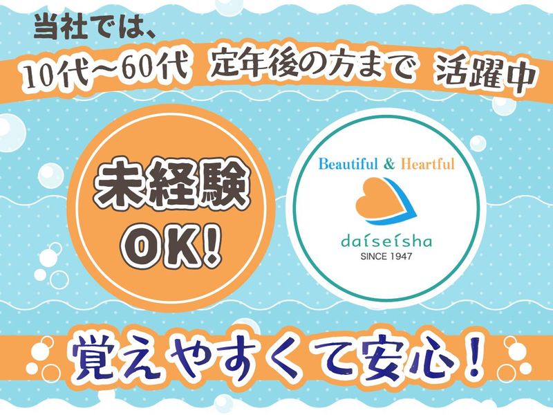 求めている人材 【未経験OK】 ※土日祝に出勤できる方、大歓迎! ◆初めての方、ブランクのある方、もちろん経験のある方も大歓迎♪ ◆「大清社」では、10代~60代、ミドル、シニア、定年後の方まで幅広く活躍中です♪ ◆男性・女性ともに大歓迎!どちらも働きやすい職場環境です◎
