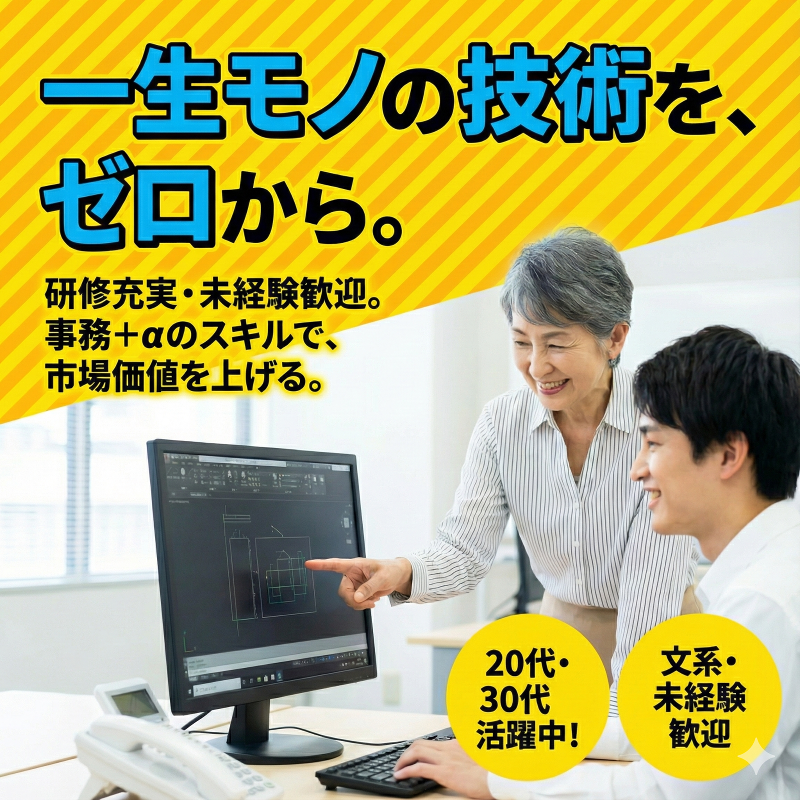 仕事内容: ━━━━━━━━━━━━━━━━━━━━━━ 「スキル」「安定」そして 「ワークライフバランス」すべてを求める方に ━━━━━━━━━━━━━━━━━━━━━━ 今回募集のCAD事務は力仕事は一切ありません! 専門スキルを駆使してプロジェクトの進行 サポートを行うポジションです! 業界随一の集中研修があるため、 未経験入社ながら活躍している先輩も多くいます。 手に職つけて長く働きたいと考えているあなたに 最高水準の研修制度をご用意してお待ちしております! この先も需要が伸びていく業界で 長く活躍し続けませんか? ーーーーーーーーーーーーーーーーーーーー ■具体的な仕事内容■ ーーーーーーーーーーーーーーーーーーーー ◆CAD(図面作成ソフト)を使った図面作成 現場がスムーズに作業できるように「設計図」 や「施工図」と呼ばれる図面の作成・修正を行います。 ◆建物等の写真のファイリング 現場の方が撮影した作業工程の写真を整理 ・管理する業務です。 ◆書類作成(見積書・請求書など) 必要書類やプレゼン資料をパソコンで作成します。 ◆その他サポート業務 電話応対や来客応対などを行います。 ※研修終了後、各配属先で実務が スタートします! ーーーーーーーーーーーーーーーーーーーーーーーー ■ステップ1:約1ヶ月の研修■ ーーーーーーーーーーーーーーーーーーーーーー まずは同期の仲間と一緒に、 研修を受講していただきます! ◆建設業界の基礎知識・PCやCAD (図面作成ソフト)の使い方 ◆基本的なビジネスマナー ◆書類の作り方・電話応対の仕方 ◆スケジュール管理の仕方 など 当社では、 “新卒並み”の手厚さを超え、 “専門学校レベル”の充実した研修をご用意! 街づくりに必要な知識を、 “同期&同世代” の仲間と学べる貴重なチャンスです。 ※研修は東京での実施となります。 ーーーーーーーーーーーーーーーーーーーーーー ■ステップ2:プロジェクトへ配属■ ーーーーーーーーーーーーーーーーーーーーーー 研修を終えた後は、 配属先で“適性にあった”仕事をお任せします。 誰でも初めての環境で働くとき には不安があって当たり前。 「ちょっと相談したいな」「こんなことで 困っている」というときは、担当営業や アドバイザーに遠慮なくご相談ください。