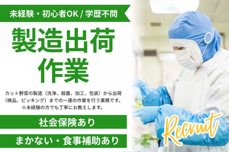【仕事内容】 お仕事内容 カット野菜の製造(洗浄、殺菌、加工、包装)から出荷(検品、ピッキング)までの一連の作業を行う業務です。 ・下処理工程・・・原料(各種野菜)を洗う・皮をむく等 ・機械工程・・・下処理を終えた各種野菜のカット等 ・袋詰め工程・・・各商品、定められた量目に計量しパックする等 ・仕分け工程・・・お客様ごとのご注文商品の荷揃え等 この各工程を一通り学んでいただき、製造管理の立場で業務にあたっていただきます。 ー 【埼玉フーズの魅力ポイント】 ー ◆選べる週休2日制! ◎ワークライフバランスを大切にする企業です! ◎年間休日は110日!条件によっては週休3日も可能です。 ◆キャリアアップも期待できます! ◎リーダー、ライン長、工場長・・・と、キャリアアップが可能です! ◎前向きに頑張るあなたを全力で応援します! 【埼玉フーズについて】 弊社は、”食品を通して社会に貢献したい”という願いをもとに、1978年の創業から現在に至るまで、多くの方の「安心・安全・美味しい」を支えてきました。カット野菜については、1991年から製造業務を始めており、30年を超える実績と経験を持っています。 私たちの扱う商品は、一年中需要が絶えません。365日稼働しているため、それぞれがシフト制で働きます。福利厚生も充実しているので、長く働くことができる環境です。 《やりがいと社会貢献がどちらも満たせる!》 私たちの仕事は、カット野菜の製造を通じて多くの家庭に安心・安全を届けるだけでなく野菜の食品ロスも防ぎます。30年以上にわたって多くのお客様に届けてきた「安心・安全・美味・健康」を、私たちと一緒に届け続けませんか? まだまだ一緒に働いてくれる仲間を募集中です!ぜひ、あなたからのご応募をお待ちしております。