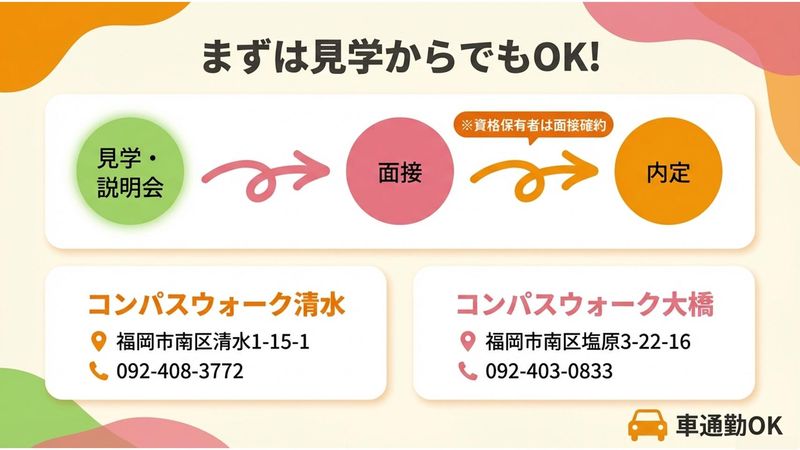 選考プロセス \まずはお気軽にご応募ください/ ❖ 応募後の流れ [1] ご応募 [2] 面接 [3] 内定・採用 【ご案内】 たくさんの方とお話したいと思っていますので、資格をお持ちの方は、面接を確約しております。 また、職場見学や会社説明、その他ご相談をご希望の方も、まずはご応募ください。ご応募のあと、弊社から連絡があった際に「見学したい」などとお伝えいただくとスムーズです。 見て、聞いて、「違うな」と思ったら、 遠慮なくキャンセルしていただけますのでご安心ください。 それではご応募をお待ちしております。