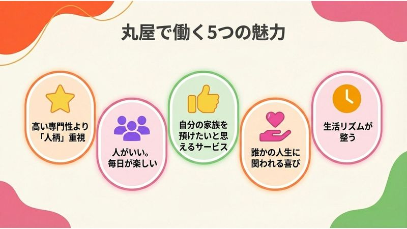求めている人材 ❖ 応募資格 ・普通自動車免許(AT限定可) ・以下のいずれかの資格をお持ちの方 # 理学療法士 # 柔道整復師 # 看護師 # 生活相談員 ﹏﹏﹏﹏﹏﹏﹏﹏ ❖ 歓迎要件(必須ではありません) ➤ 各資格をお持ちの方に共通 [1] デイサービス、介護予防分野の経験者大歓迎! [2] デイサービス未経験者歓迎 [3] 専門学校卒歓迎、第二新卒歓迎 [4] 車の運転が好きな方 [5] 利用者様とのコミュニケーションを大切にできる方 [6] チームワークを大切にできる方 ┏━━━━━━━━━━━━━━━━━┓ ❖ 例えば、どんな人に向いていますか? ┗━━━━━━━━━━━━━━━━━┛ この仕事に向いているのは、 「人と関わることを楽しめる人」です。 利用者様との何気ない会話を楽しめる。 ちょっとした変化に気づいて、「今日、いい顔してますね」と声をかけられる。 そんな時間を、「仕事」としてではなく、自然に楽しめる方が、この職場では長く、気持ちよく活躍しています。 今の職場で ✓「もっと人と向き合う仕事がしたい」 ✓「数字や効率より、笑顔が増える毎日を送りたい」 そう感じている方には、きっとしっくりくる環境です。 ┏━━━━━━━━━━━━━━━━━┓ \一つでも当てはまる方にぴったり!/ ❖ こんな人と働きたいと思っています! ┗━━━━━━━━━━━━━━━━━┛ ◤[1] おしゃべりが好きな人 無駄話を含めた会話が、ここでは大切な仕事の一部。 話すことが苦にならない人ほど、現場に自然と溶け込みます。 ◤[2] 楽しい空気をつくるのが好きな人 利用者様も、スタッフも、笑っている時間が一番元気になる。 そんな空気を大切にできる方を歓迎します。 ◤[3] 前向きで、素直な人 完璧さよりも、「もっと良くしたい」という気持ちを大事にしています。 ◤[4] 「敬護」という考え方に共感できる人 私たちが大切にしているのは、お世話をする「介護」ではなく、人生の大先輩を敬い、守る「敬護」。 育ててくれた世代への御恩を、この仕事を通じて返していく。 その想いに、少しでも共感できる方と働きたいと思っています。 ◤[5] スキルよりも、人としての温かさがある人 私たちは、高いスキルや専門性よりも、人としてどう向き合うかを大切にしています。 無理をせず、肩の力を抜きながら、 利用者様に安心と笑顔を届けたい。 そんな想いを持つ方を歓迎しています。 ﹏﹏﹏﹏﹏﹏﹏﹏ ❖ 応募しやすい条件も揃っています♪ ・学歴不問 ・年齢不問 ・主婦・主夫歓迎 ・ブランクOK ・即日勤務OK ・平日のみOK ・副業・WワークOK ﹏﹏﹏﹏﹏﹏﹏﹏ ┏━━━━━━━━━━━━━━━━━━━━━┓ ❖ 働くなら絶対「丸屋」! 当社のデイサービススタッフとして働く5つの魅力 ┗━━━━━━━━━━━━━━━━━━━━━┛ ⭐[1]人がいい。だから、毎日が楽しい 実際に、「この人と一緒に働きたい」と思ったスタッフに惚れ込んで、入社を決めた人がいます。 「この人たちとなら、きっといい仕事ができると思った」そう話してくれました。 現場には、自然と声をかけ合い、笑い合える空気があります。 誰かが頑張っていると、周りも自然に応援したくなる。 人間関係で気を遣い続ける職場ではありません。 だからこそ、毎日を気持ちよく続けられます。 ⭐[2]自分の両親を、安心して預けたいと思える スタッフ自身が、「自分の家族にも通わせたい」 そう思いながら働いているデイサービスです。 利用者様の安全と尊厳を何より大切にしているからこそ、働く側も、心から「任せられる」と感じられます。 ⭐[3]誰かの人生に、ちゃんと関われる仕事 ここでは、深刻な顔で頑張るリハビリはしません。 会話をしながら、笑いながら、気づけば少しずつ体が動くようになる。 そして、「今日はここまで歩けたよ」 そんな言葉を、一緒に喜ぶ。 その積み重ねの先で、「あなたがいてくれてよかった」 そんな一言を、ふと受け取ることがあります。 誰かが元気になっていく瞬間に立ち会い、その想いが、ちゃんと自分の心に残る。 それが、この仕事のいちばんのやりがいです。 ⭐[4]資格は、“武器”ではなく“道具”でいい 応募条件は、いずれかの資格を持っていることだけ。 「常に高い専門性を求められる」 「結果を出し続けなければならない」 そんなプレッシャーはありません。 あなたがこれまで積み重ねてきた経験を、無理のない形で、自然に活かせる。 それで十分です。 ⭐[5]生活リズムが整い、心に余裕が生まれる 夜勤はありません。 土日はしっかり休めます。 決まった時間で働けるから、生活リズムが自然と整います。 家族との時間も、大切にできる働き方です。 心に余裕があると、人にも優しくなれる。 その余裕が、利用者様との関わりにも、そのまま表れます。 無理をしない働き方が、結果的にいちばん良い仕事につながる。 私たちは、そう考えています。 ┏━━━━━━━━━━┓ ❖ コンパスウォークとは ┗━━━━━━━━━━┛ コンパスウ