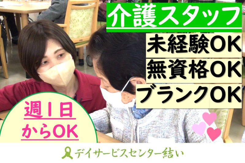 【仕事内容】 デイサービス勤務の介護職員を募集します! 【アピールポイント】 ・週1日からOK ・1日4時間からOK ・無資格、未経験OK ・ブランクOK ・日勤のみの勤務 ・扶養範囲内も、社会保険加入のフルタイム勤務希望もお待ちしています! ※正社員登用制度あり はじめての介護やブランクある方も活躍中!ほとんどのスタッフが介護未経験からスタートしています。 ■具体的なお仕事内容 ・トイレや入浴、食事介助 ・レクリエーション実施 ・介護記録 など 【ここがポイント】 ・送迎を協力してくださる方は時給UPします。(任意です) ・祝日に勤務していただいた場合は時給100円UPします。 ・パートさんも有給休暇あり(有給日数は就業日数によります) ・午前だけ、午後だけ働きたいなど、家庭との両立がしやすいです。 ■施設のコンセプト 「結い」の名前には、住み慣れた地域の中で自分らしい毎日が送れるように、地域や家族・大切な人との結びつきを、結いに通うことで叶えていただきたい。そんな思いが込められています。 そのために、「自己選択」「自己決定」でのサービス提供を基本としてご利用者様の「こうしたい」のお気持ちに寄り添いたいと考えています。 ■まずは職場を知ってください 様々な年代の、若手からベテランまで幅広い年齢層のスタッフが活躍しており、先輩が後輩をサポートする社風が根付いています。 「どんな風な仕事ぶりかな?」 「どんな職場環境かな?」 「いきなり面接は不安・・・」 「様子を見てみたい」 など、お仕事に興味を持っていただいた方は、施設見学だけでもぜひ!お気軽にお問い合わせくださいね。 【求人ID-YU01】