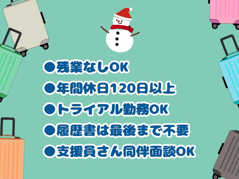 求めている人材 ◎未経験・ブランクOK ◎駅チカ通勤楽チン ◎従業員用休憩室あり ◎購入なし・出費なし ◎長期も短期もOK 必須条件:お話することや対人接客がNGではないこと 歓迎条件:笑顔で挨拶できること \オススメポイント/ 1. 接客への不安を安心に アウトレットは混雑します。 パニックにならないか、体力が持つかを心配される方もいらっしゃります。 ▶バックヤードの選択肢 まずは品出しや検品からスタートしましょう。 慣れてきて、できそうであれば接客というステップップもOKです。 ▶チーム体制バックアップ 注意が散漫になって迷惑をかけないか不安という方もいます。 しかし、複数名体制なのでお互いのミスを助け合っている環境です。 困った時は店長と先輩がすぐにフォローします。 2. アウトレットならでは ▶状況が変わりにくい いつもにぎわっているので、今日は空いてるから新しいことをして、というような予定変更が少ないです。 ▶従業員特典 会員証を使った特典が自分のお店以外でもあります。 ▶メリハリのある働き方 週3日働いて、ほかはゆっくり休めるという習慣を固定できます。 3. 合理的配慮 ▶休憩の取り方 体調に合わせてこまめに休憩を挟むなどの相談も可能です。 プロの支援者がいるわけではありませんが、ぜひどうしてほしいかを教えてもらいたいです。 ▶通院配慮 平日しかやっていない病院や土曜がすごく混むところが多いですよね。 通院のお休みがしっかり確保できます。