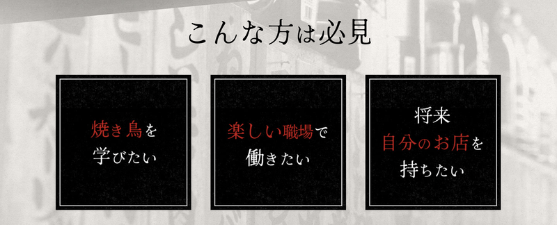 求めている人材 当店では一緒に働いてくださるスタッフ、特に正社員の方を積極的に募集しています。 仕入れや串打ち、店舗運営など、すべて一から指導しますので、未経験の方でも安心です。 ポテンシャル採用積極的に取り入れています。 「楽しい職場で働きたい」 「飲食店で働きたい」 「焼き鳥の技術を学びたい」 という考えをお持ちの方は、どうぞ気軽にご連絡ください。