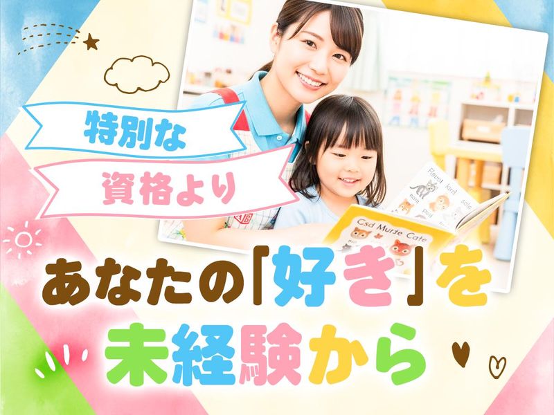 求めている人材 学歴・資格不問!未経験OK! 英語が話せなくても問題ございません♪ 正職員登用も行なっております! <こんな方は大歓迎◎> ・英語や運動に興味がある方 (知識・スキル不問◎) ・保育士資格をお持ちの方 ・保育園もしくは幼稚園での経験がある方 ・幼稚園教論免許をお持ちの方 <こんな方が向いてます◎> ・子どもが好きだけど、保育士資格はまだ持っていない方 ・子育て中の方(職員が多いためお休みが比較的取りやすいです♪) ・ライフワークバランスを重視される方