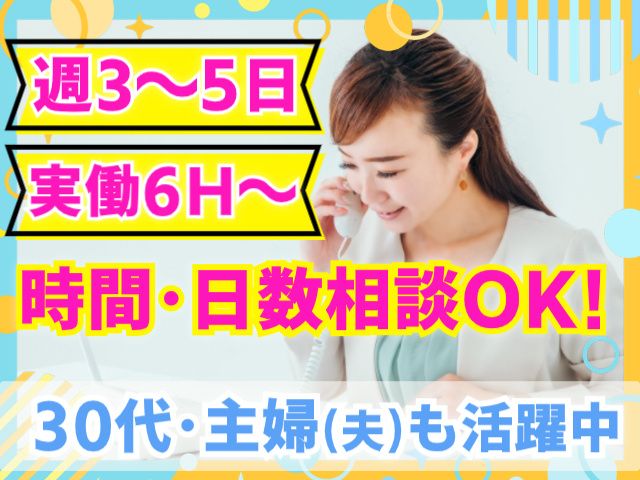 仕事内容 <週3日~5日勤務!> 30代・主婦(夫)パート活躍中! 家庭と両立できるテレアポ業務! 営業活動は一切なし!アポ取得のみ! テレアポやコールセンター経験がある方は 即戦力としてご活躍いただけます! ※PC操作(入力・検索)ができれば未経験の方もOK! <働きやすいポイント> ・フル、時短どちらでもOK! 9:00~18:00の間でお好きな時間帯で働けます! (実働6時間以上) 上記以外にご希望の時間・日数があれば お気軽にご相談ください! ・完全土日祝休み GW・夏季・年末年始休暇もあり! 家庭や私生活重視で働けます。 <テレフォンアポインターのお仕事> テレアポリストはこちらで準備しているので 電話掛けをしてもらうだけです! ~業務の流れ~ テレアポリストを見ながら、企業様へご案内のお電話 (マニュアルあり) ※一部企業様のHPを見たり、他サイトで求人を掲載していないかなどの検索作業あり ↓ 営業スタッフがお伺いするスケジュールを決める (契約を取るわけではなく、アポ取得のみ!) ↓ PCに結果を入力 (フォーマットがあるので簡単!) ・架電数目標 1700件~/月(フルタイムの場合1日80件カウント) <主婦(夫)パートさんも活躍中> 土日祝休み、長期休暇もあるので 家庭と両立しながら無理なく働けます。 勤務時間・日数はご相談ください。 <活かせる経験> ・テレフォンアポインター(テレアポ) ・コールセンター ・求人広告業界での業務経験 ・接客業、受付事務 など (在宅でのテレアポ経験も活かせます!) <職場について> 20~40代スタッフ在籍! ベテランスタッフが多数おりますので、 分からないことがあれば何でも聞いてくださいね。 服装はオフィスカジュアルで出勤となります。 テレアポ経験問わずパートさん募集中! 子育てが落ち着いて復職したい方もOK! ご応募お待ちしております!