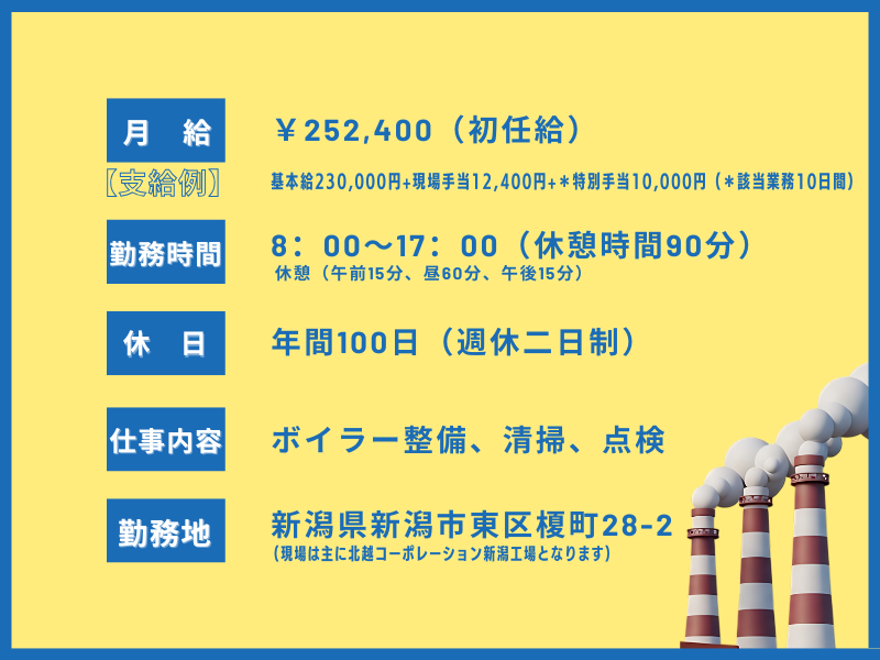 仕事内容 ■━━━━━━━━━━━━━━━━━■ 未経験からでも始められます。 地元で腰を据えて働きたい方、大歓迎! ■━━━━━━━━━━━━━━━━━■ ⭐安心してキャリアを築ける経営基盤 ⭐月給23万円+手当1~2万円+賞与あり(年2回)! ⭐残業は月2~3時間未満と少なめ \働きやすく、安定感も抜群!/ 私たち渡辺建設株式会社は、 日本有数の大手製紙メーカー 「北越コーポレーション株式会社」の 協力会社として、 約70年にわたり安定した経営を 続けています。 今回募集するのは、 【北越コーポレーション新潟工場の ボイラー整備士】。 工場の“心臓部”を支えるポジションです! 目立つ仕事ではありませんが、 工場に”なくてはならない”大切な仕事です。 社員一同、あなたのご応募を 心よりお待ちしております! ⏩お仕事内容について ────────────────── 北越コーポレーション新潟工場内を 中心に、 諸官庁や一般企業のボイラー整備を 担当していただきます。 ▨ボイラーの点検 ▨補修整備 ▨突発的な修理対応 ▨付属機器の点検・清掃・修理 など 主な現場は、 北越コーポレーション新潟工場のほか 新潟市役所関係の案件もあります。 工場に欠かせない設備を守る、 やりがいのある仕事です◎ 【居心地の良さに自信アリ✨】 現場では、声のかけ合いやこまめな休憩を 心がけ、安全を第一に社員同士が連携 しながら作業を行っています。 職場の風通しも良く、頼れるベテランも 多いので、安心して勤務いただけますよ! 【プライベートもしっかり確保✨】 残業は月2~3時間未満と少なく、 「プライベートを大切にしたい!」 という方に安心の職場環境♪ 定時であがれる日がほとんどで、 活躍中の社員も、家族との時間や趣味の時間 など自分の時間を大切にできています。 ╭━━━━━━━━━━━━╮ ⭐インスタグラムも公開中⭐ ╰━v━━━━━━━━━━╯ 【watanabe_kensetsu1956】 入社後のイメージ、きっと掴めます! 職場の雰囲気が分かる動画も ご用意していますので、 ぜひチェックしてみてくださいね♪ ⏩会社紹介 ────────────────── 渡辺建設株式会社は、創業70年を迎える 安定企業です。 北越コーポレーション株式会社の協力会社 として、千葉・新潟・茨城の各地で リサイクル・建設事業を展開。 「和・創造・感謝」を大切に、 安全第一で地域の皆様に貢献できるよう 100年企業を目指して成長を続けています。