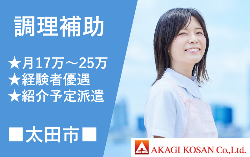 仕事内容 【急募】【正社員登用*2ヶ月後】【有資格者】【年間休日120日以上】 病院・施設内の調理補助(紹介予定派遣)新規募集 <仕事内容> 病院・施設内の厨房にて調理の補助 *実際に調理はなく盛り付けのみの簡単なお仕事です <資格・経験> ・管理栄養士 ・栄養士 ・調理師 *上記資格のいずれか所持者 ・未経験者OK ・経験者優遇します <勤務地> 群馬県太田市内の病院、介護施設 *桐生市にも勤務地あり(選択可) ・マイカー通勤可 ・交通費規定内支給 ・駐車場完備 <雇用・期間> 紹介予定派遣(即日~長期) *2ヶ月後、正社員登用 *入社日相談OK *急募案件 <私たち赤城工産にぜひご相談ください> ・人材サービス歴25年以上!群馬、栃木、埼玉のお仕事探しはおまかせください! ・職業紹介(正社員)の他にも派遣社員のお仕事紹介できます ・地元のお仕事案件多数あり!長期派遣のお仕事はほぼ全て正社員登用ありのお仕事です! ・日払い、週払い、前払いに定評あり! ・パート、アルバイトでお仕事を探している方、もっと条件の良い正社員・派遣社員のお仕事紹介致します。