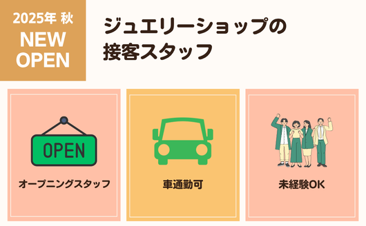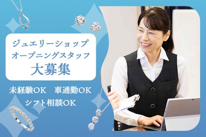 PR・職場情報 \\アゼリアモール内のジュエリーショップでの接客スタッフ募集// おすすめポイント! ◎未経験スタートでも活躍できる! ◎スキルが身につく! 「ジュエリーが好き」「人と接するのが好き」——そんな気持ちがあれば、未経験でも大歓迎です。 接客や販売の経験がなくても、店長や先輩スタッフがそばでしっかりサポートしますのでご安心ください。 ◎30代~60代のスタッフが多数活躍中! 当社では、ジュエリーが好きという気持ちを大切にしています。 実際に「詳しい知識はないけど、ジュエリーが好き!」という理由でスタートしたスタッフも多数。 年齢や経験に関係なく、あなたらしく輝ける職場です。 ◎ブランクOK!先輩たちのサポート充実 接客や商品知識はお仕事をしながら徐々に覚えればOKなので、安心してお仕事を始められます。 「人をきれいにしたい」「誰かの笑顔のきっかけになりたい」——そんな想いを、ぜひここで活かしてください。 求人の特徴 \\アゼリアモール内でのジュエリーショップの接客スタッフ募集// ■先輩スタッフからのメッセージ この仕事でやりがいを感じるのは、ご提案した商品のコーディネートを気に入っていただいた時。お客様との会話の中でどのような商品を求めているのか、どのようなジュエリーが似合うかを考えてご提案します。お客様によって好みが違うのでそれぞれに似合う商品を考える時も楽しいですが、それがお客様の好みにばっちり当てはまった瞬間は特にやりがいを感じます。 求人ポイント シニア応援,社員登用あり,昇給あり,残業なし,交通費支給,急募,主婦・主夫歓迎,資格取得支援あり,長期,フリーター歓迎,大量募集,車通勤OK,転勤なし,未経験者歓迎,経験者歓迎,月1シフト提出,研修あり,社会保険完備,50代以上応募可,ブランクOK,育休制度あり,U・Iターン歓迎,家庭都合休OK,禁煙・分煙,シフト制,社割あり,ピアスOK,40代以上応募可,第二新卒歓迎,産休制度あり,週5からOK,産休・育休取得実績あり