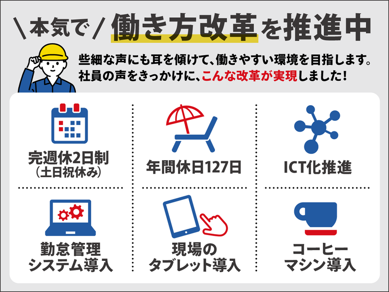 仕事内容 \「転職してよかった!」の声を大公開!/ 【地域】に【社員】に還元できる企業へ! *住宅手当や特別休暇など私生活にも「+α」 *土日祝休み × 年休127日 × 月残業平均5h ~老舗企業の改革はまだまだ止まらない~ --<施工管理経験3年以上の方募集>-- 【仕事内容】 工程管理/安全管理/品質管理/原価管理 [現場]群馬県内 [工事]橋梁工事・トンネル工事・ 道路工事擁壁工事・砂防工事・河川工事 ※現場は群馬県内。県外出張ほぼなし! 【 転職組に聞いた!当社の魅力はココ! 】 01:大規模工事に携われる「やりがい」  ̄ ̄ ̄ ̄ ̄ ̄ ̄ ̄ ̄ ̄ ̄ ̄ ̄ ̄ ̄ ̄ ̄ ̄ 「会社で携わっている工事を見かける 機会も多く、”あれがパパの会社の仕事だよ” と子供に自慢しちゃってます(笑)」 02:複数人担当制で安心感&効率UP  ̄ ̄ ̄ ̄ ̄ ̄ ̄ ̄ ̄ ̄ ̄ ̄ ̄ ̄ ̄ ̄ ̄ ̄ 「前職は1人で管理していたので、 チームで悩みを解消できるのが大きい。」 「自分にないアイデアを取り入れられる!」 「施工管理だけじゃなく作業員の方からも たくさんアドバイスを貰えるのが助かる!」 03:後輩教育など多方面で成長できる!  ̄ ̄ ̄ ̄ ̄ ̄ ̄ ̄ ̄ ̄ ̄ ̄ ̄ ̄ ̄ ̄ ̄ ̄ ̄ 「会社全体でイチから育てる雰囲気があり、 教えることから得られる刺激があった!」 -------------------- より働きやすく ~働き方改革の一部を紹介~ -------------------- *完全土日祝休み *年間休日127日 *デジタル技術導入による残業月平均5h *現場で頑張る社員のために、 ほっと一息つけるコーヒーマシンの設置 *2026年4月には基本給もアップ予定 長く勤めていただきたいからこそ、 働きやすさの整備に力を入れています! 「もっと〇〇したい・・・!」といった 社員の希望や、ちょっとした”負”も解消して より働きやすい環境を目指します。 【会社概要】 *建設業評価Aクラス (昨年度土木部門県内5位) *年間施工(建築:150件 土木:200件) *社員114人 *平均勤続年数18年 施工実績多数!気になった方はHPへ >>https://tsukamotokensetsu.co.jp/ スペシャルムービーも!採用サイトはこちら >>https://tsukamotokensetsu.co.jp/recruit/