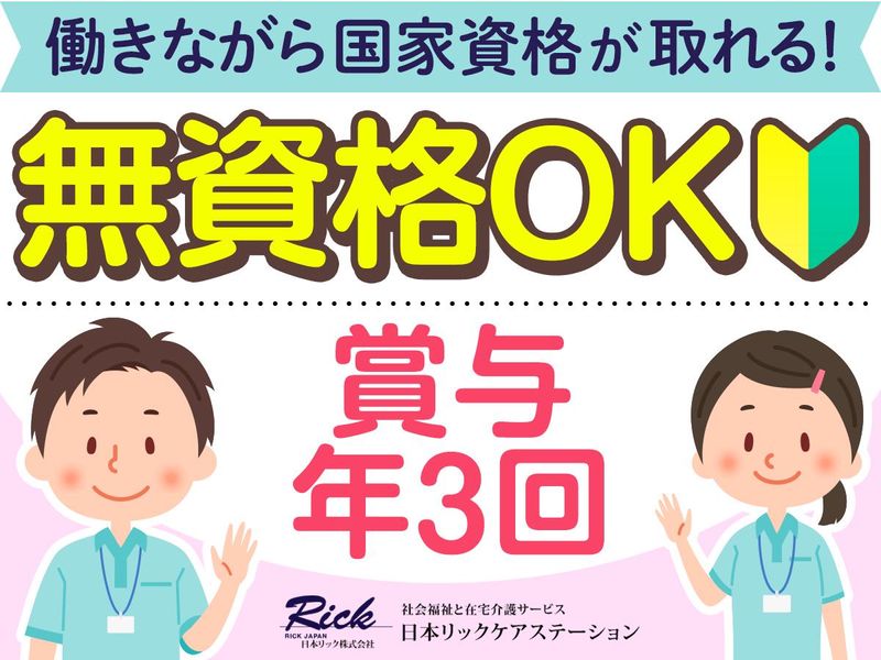 【保険制度】 雇用保険、労災保険、健康保険、厚生年金 待遇・福利厚生 【福利厚生】 ・定期健康診断 ・日本リック(株)互助会を通じた 福利厚生活動 (結婚・出産お祝い金、お見舞金、弔慰金、旅行・クラブ活動など) ・健康保険組合の保養所等利用可 ・介護職員初任者研修・実務者研修費用全額負担 ・介護福祉士受験料キャッシュバック、ケアマネ更新研修等も業務扱い ・自転車・レインコート・携帯電話貸与あり ★昇給年1回(4月)・ 賞与年3回(夏季・冬季・年度末) ※正社員登用後より対象 <通勤交通費> ・公共交通機関の定期券代を支給 (2キロ以上、上限35,000円まで) ・自転車通勤も可 (2キロ以上は手当あり)