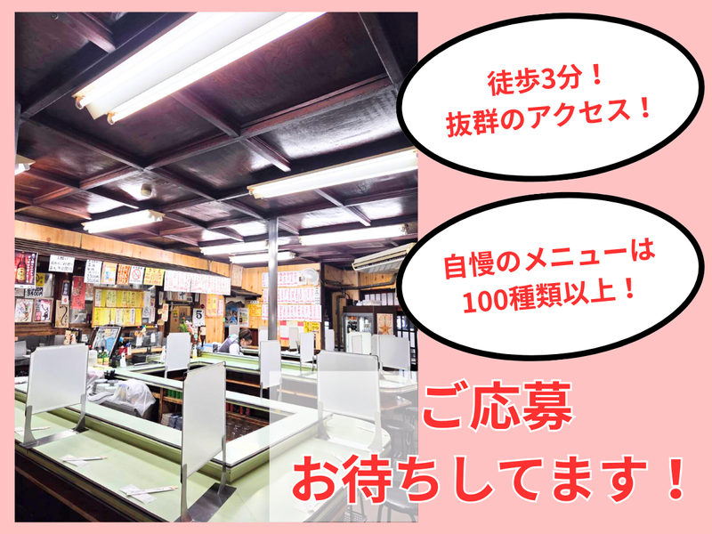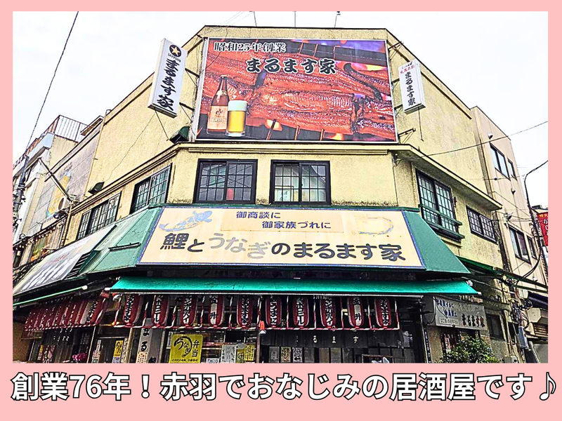 仕事内容 昭和25年より続く老舗「鯉とうなぎのまるます家 総本店」にて、ホール業務全般をお任せします。 難しいマニュアルよりも、あなたらしい元気な接客でお客様をもてなしてください! ✅ 創業76年の安定感!赤羽一番街で長く愛され続ける有名店 ✅ ガッツリもゆったりも!自分のペースで働ける自由シフト ✅ 毎日4名体制でフォロー万全!チームワーク自慢の職場です ❑仕事内容  ̄ ̄ ̄ ̄ ̄ ・お客様のご案内 ・料理やドリンクの提供 ・レジ業務や、テーブルの片付けなど ❑ お店の魅力  ̄ ̄ ̄ ̄ ̄ ̄ ̄ ̄ ✨抜群のアクセス! ➡赤羽駅東口から徒歩3分。活気あふれる「一番街商店街」の中にあります。 ✨唯一無二のメニュー! ➡国産うなぎや珍しい鯉料理など、自慢の味は100種類以上。毎日たくさんの方で賑わう繁盛店です。 ✨幅広い出会い! ➡常連様から、赤羽の「せんべろ文化」を楽しみに来られる初めてのお客様まで、明るい会話が絶えないお店です!