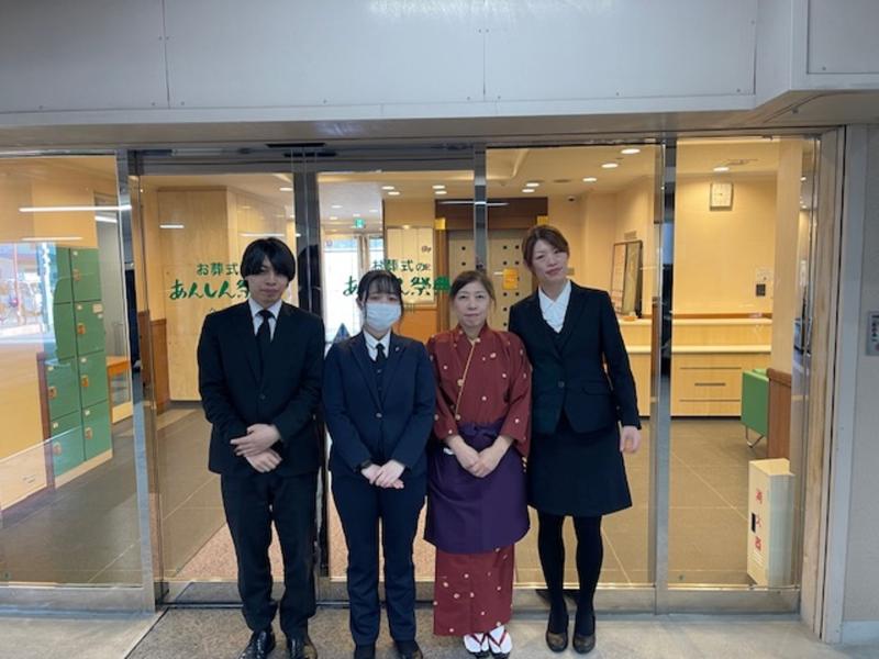 アピールポイント: 【大好評のあんしんパンダのCMでおなじみのあんしん祭典】 都内自社式場数NO1.あんしん祭典でのお仕事です! ☆未経験からスタートOK! 知識やスキルが求められる仕事はそれぞれの部門の社員が担当していますが、 今回は、ご葬家の担当としてお客様に寄り添って頂くお仕事です。 未経験の方も安心。 「人の役に立ちたい」「丁寧なおもてなしがしたい」そんな想いがあれば大丈夫です。 ☆主婦さん活躍中☆ 年齢を問わず採用します。 子育てが落ち着いた方や、家事・介護などと両立して働きたい方も大歓迎です◎ 三者面談などの学校行事はもちろん、どうしても外せないご家族の予定などシフトは希望を考慮するのでご安心ください。 女性ならではの細やかな気遣いが、 活かせるお仕事ということもあり、 女性が多く活躍しているお仕事です。 キャリアUP可能 先々正社員を目指している方にもぴったり! 最初から社員になるわけではなく、式場の雰囲気や仕事内容を実際に体験した上で希望があれば正社員に登用されます。 セレモニーの司会というポジションもあるので、キャリアUP・スキルUPを目指したい方はぜひお気軽にご応募ください♪