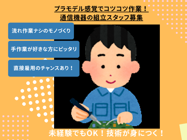 通信機器を一から組立・もくもく作業・座り仕事も有/モクモク作業/日勤/土・日・祝は休み/週払いOK 最適な職場を探す求職者と企業を結ぶ私たち。 長年の経験と豊富なネットワークを強みに 一人ひとりに向き合って、その人にマッチしたお仕事をご提供! 気持ちに寄り添い、万全のキャリアサポートで 様々なニーズにお応えしています。 「自分に合った働き方を見つけたい」 そんなあなたを応援します!
