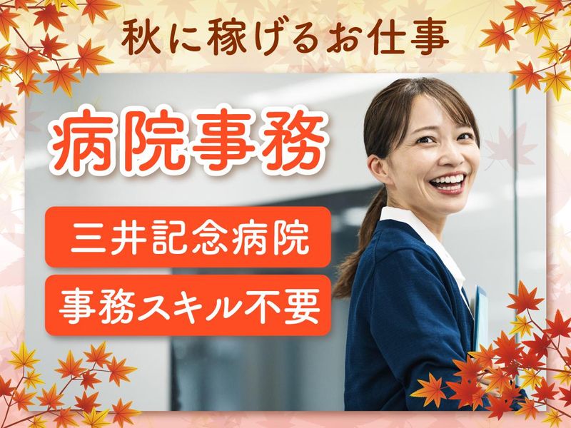 仕事内容 ジメジメ・むしむしの猛暑が落ち着いた 「秋」がお仕事開始のチャンスです!! 涼しくなった秋からの勤務なら、 行き帰りの通勤ストレスも軽減◎ さらに、何かとお金のかかる年末年始 に向けてコツコツ貯金もできます♪ ⭐初心者でも高時給1500円! ⭐17時退勤&残業ほぼなし! ⭐基本土日祝休み! ⭐駅チカのキレイな病院勤務! ⭐50代の主婦さんが活躍中! 「食欲の秋!週末は家族と 美味しいモノ食べに出掛けたい」 「行楽の秋!友達と 温泉旅行の計画を立ててます!」 「紅葉の秋!主人と毎年行く京都旅行。 今年は少しいいホテルに泊まりたい!」 なんて楽しい計画をたてながら、 高時給で効率よく稼げる 【病院事務】のお仕事始めませんか? ∴‥∵‥∴‥∵‥∴‥∴‥∵‥∴‥∵ お仕事詳細  ̄V ̄ ̄ ̄ ̄ ̄ PCスキル不問! 診察室へのご案内業務がメインです♪ 簡単な入力作業もありますが、 PCが苦手なスタッフもこなせてます◎ 【具体的には…】 *診察室内へ呼び出し *次回予約時の注意事項など患者さんへの説明 *医師や看護師へ診察進行状況の確認や伝達 *歩行が困難な患者さんの誘導 【三井記念病院】は 創立100年以上の歴史を持つ 都内の中核病院。 アクセスが良いだけでなく 建物内もキレイで働きやすいですよ◎ 【働くスタッフの声】 ✅50代女性 ようやく子育てが落ち着いたので これからは自分のために 時間とお金を使おうと思って、 まずはお仕事探しからスタート! 夏は暑すぎて働く気にならなかったので 秋から本格始動♪ 医療業界って難しそうなイメージでしたが こちらの仕事はPCスキル不要ということで 「私にもできそう」と思って応募しました。 はじめにイチから丁寧に教えてもらえるので 安心して始められます。 家計の足しや老後のためにも イロイロとお金が必要だけど… 秋に友達と温泉旅行に行く予定なので まずはそのための貯金をしています◎ ∴‥∵‥∴‥∵‥∴‥∴‥∵‥∴‥∵ 【サポート体制バッチリ】 お仕事の初日はもちろん同行! 悩みや先輩事があればいつでも 相談に乗ります◎ 「自分に合う仕事が分からない」 「人間関係が合わない」 「残業がきつい」 「辞めたいけど次の就職先が決まらなくて」 など快適にお仕事ができるよう いつでもサポートします! 話し合いながら、 一緒にお仕事を探していきましょう♪ 【人事評価制度バッチリ】 「弊社オリジナル業務マニュアル」を ご用意してますので安心◎ 20年以上もの弊社の経験に基づいて 作成した秘伝のマニュアルです! 定期的な研修を行いながら リーダー・サブリーダー・チーフへの キャリアアップが可能です◎