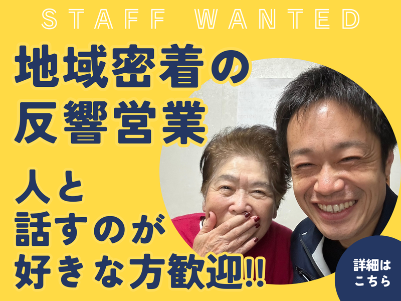 求めている人材 \建築・住宅業界の経験不問!!/ 【応募条件】 ⭐未経験OK!人柄重視の採用です - ◎こんなアナタにオススメです! ・誠実にお客様に向き合える ・コミュニケーションを大切にできる ・「学びたい」という意欲がある ・地域で長く働きたい方 - ◎今回募集するお仕事では 【リフォーム営業】 【住宅メンテナンススタッフ】 【ハウスクリーニングスタッフ】 【設備点検スタッフ】 【塗装・外装リフォームスタッフ】 【建物診断スタッフ】 【ルート営業(住宅関連)】 【ガス・水道などのインフラ点検スタッフ】 【地元密着の訪問サポートスタッフ】 【アフターメンテナンス担当】 などの経験もあれば活かせます! -