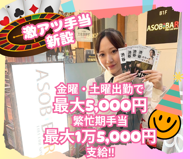 求めている人材 【未経験者大歓迎!】 ・とにかく元気で明るい接客なら誰にも負けない!そんなアナタ大歓迎! ・未経験者さん大歓迎!(初めてのバイトチャレンジも大応援!) ・新しいチャレンジを行うことで、これまでにない楽しみを実感したい方大歓迎! ・これまでに接客や飲食店、サービス業界経験者さん、音楽フェスなどのイベントスタッフさん! …etc.エンタメ業界での勤務経験者の方も大歓迎! 【こんなみなさんが活躍中!】 ・モデル、俳優、DJ、芸人の卵が活躍中! ・20代、30代の楽しい男女が多数活躍中! ・学生・フリーターさんたちが時間を有効活用しながら活躍中! ・掛け持ち・Wワーク・副業で稼ぐ仲間が活躍中! ・とにかくイベント大好き! ・盛り上げるのが大好きで自称、盛り上げ隊長の方! ・人とお話をするのが大好きな方! ・アソビバーをチェックしていた!いや、いったことが有る!または、とても興味がある方! ・楽しいことをしながら働きたい方! ・周りのみんなを楽しませるのが得意な方! ・ゲームやカラオケなど、遊ぶことが大好きな方! 【未経験からでも安心なシステムって?】 みんな初めは、未経験!そんなみなさんでも安心して、 お仕事ができるように社内研修をご用意しています。 仕事の「これってどうするの?」や「自己成長なども」なので、学生の方には就活で活かせるノウハウも! 一人ひとりのみなさんがチーム力やコミュニケーション力を身に着けて頂けるようにバックアップ! ・みんなが、楽しく成長できるプログラムでお迎えします! (分からないことや個人的なお悩みなどでも真剣に対応しますので、ご安心ください!)