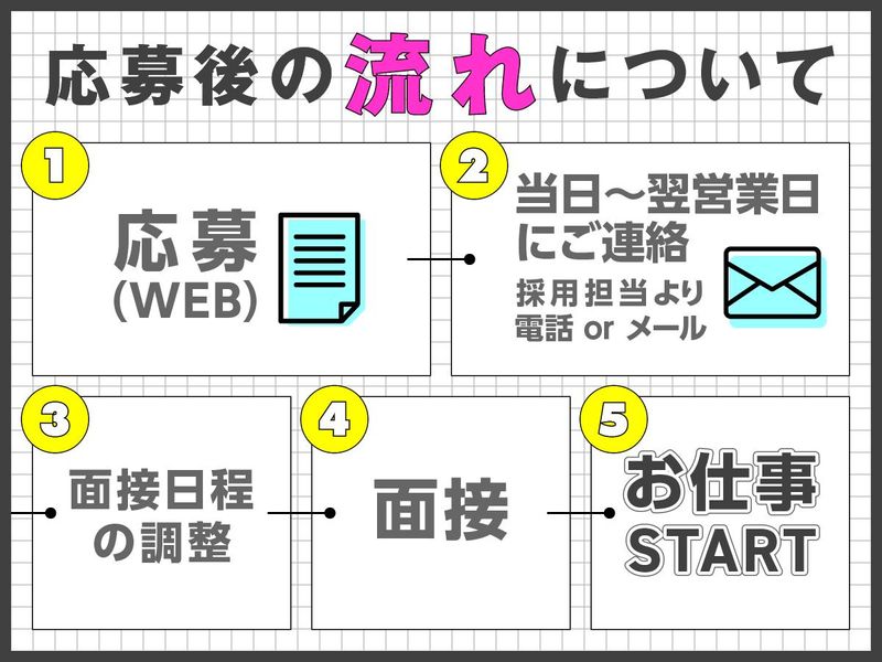 選考プロセス <WEBでのご応募> 24時間、応募受付中! 必要事項を記入のうえご応募下さい。 担当者よりご連絡させて頂きます。 <お電話でのご応募> 「名古屋のマイナンバーの 広告を見ました」と言って頂けると スムーズにおつなぎできます。 お電話がつながりにくい場合は WEBよりご応募ください。 <応募後の流れについて> [1] 応募(電話orWeb) ↓ [2] 当日〜翌営業日にご連絡 電話 or メール(採用担当より) ↓ [3] 面接日程の調整 ↓ [4] 面接 勤務地にて、面接会を開催します! ↓ [5] お仕事スタート! ⭐詳細はお気軽にお問い合わせください。
