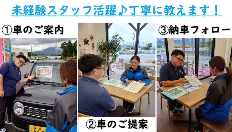 職場環境 1年目は先輩がしっかりサポートします♪ 最初は洗車をしながら車を覚えたり、 洗車ができるようになったら接客や商品を覚えます! まずは先輩の姿を見たり ロープレもするので、半年位でできるようになります♪