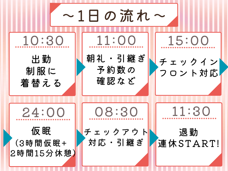 固定時間制 勤務時間詳細 総労働時間:1ヶ月あたり138時間15分 〜 158時間 10:30~翌11:30(実働時間19時間45分) (休憩5時間15分あり ▶仮眠3時間、1時間×2回=2時間、朝15分×1回) 実働は1回約20時間ですが、休憩・仮眠はしっかり5時間以上。 勤務は週2回なので、 まとまった自由時間がたっぷりとれる、 「メリハリある働き方」ができます。 ~1日の流れの一例~ 10:30:出勤・制服に着替える 11:00:朝礼・引継ぎ・予約数の確認など 15:00:チェックイン対応・フロント対応 24:00:仮眠(3時間仮眠+2時間15分休憩) 8:30:チェックアウト対応・引継ぎ 11:30:退勤