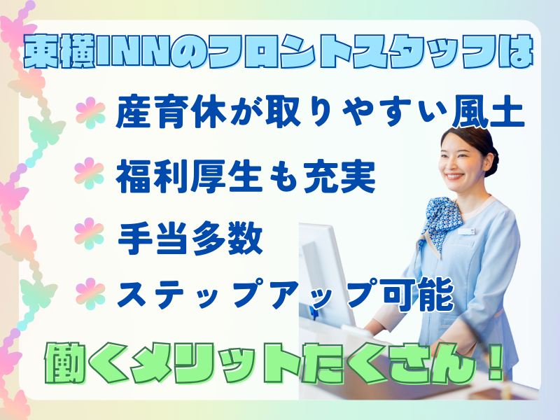 【保険制度】 雇用保険、労災保険、健康保険、厚生年金 待遇・福利厚生 【福利厚生】 ・昇給年1回 ・賞与年2回 ・交通費支給(月上限5万円) ・残業代別途支給 <各インセンティブあり♪> ・稼働率に応じたインセンティブ(5,000円~1万円/月) ・売上達成奨励金 ・会員獲得手当 ・深夜手当 ・資格手当※入社後の取得に限る(月1,000~5,000円) ・社会保険完備 ・制服貸与 ・有給休暇(入社6ヶ月後付与) <充実のキャリアアップ制度> ・資格取得支援(英検・簿記・パソコン検定・秘書検定) ・チャレンジ制度 └支配人や本社部門へのキャリアアップも目指せます <福利厚生充実◎> ・社員宿泊割引制度 └全国の東横イン宿泊30%OFF/本人、20%OFF/家族・知人 ・従業員割引/ベネフィット・ステーション →弊社と提携している会員制で、 お得な待遇が受けられるサービス。 約14000施設の宿泊施設に 会員価格でお得に利用ができたり、 その他にも・・・ ✅スポーツクラブ ✅介護・育児 ✅健康管理 ✅研修講座 ✅エンターテイメント ✅物販 etc 6000以上の様々なライフサービスを 揃えています。 これらすべてのメニューを 会員特別価格で 利用することができるサービスです♪ <その他> ■研修制度あり ■退職金制度(勤続3年以上)