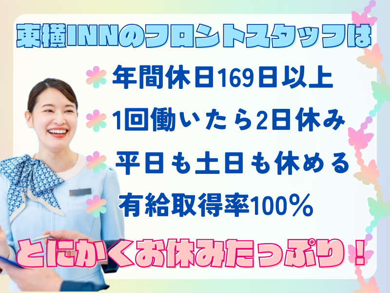 仕事内容 前職は毎日バタバタ。 家族と話す時間も、 自分のことを考える余裕もなかったんです。 それが、”週に2回出勤” 今の働き方に変えてから、人生が本当に変わりました。 “仕事に追われる日々”から、 “自分と家族の時間を取り戻す働き方”へ。 ■仕事内容 ・チェックイン/アウト対応 ・予約の電話・メール対応 ・備品の手配、宅配便の受付 ・ロビーや客室の最終チェック・簡単な清掃 ・PCによる日報・書類の入力業務 ◤出勤は週2回ほど、正社員の新しい形◢ 東横INNのフロントスタッフは 1回働いたら2日間お休みというサイクルだから、 生活のリズムが整います。 残業も少なく、退勤後にそのまま旅行や趣味の時間にも。 これまで「働く=消耗」だった方へ、無理のない働き方を。 ◤ずっと地元で働ける◢ 「地元を離れたくない」 「転勤のない職場がいい」 そんな方にピッタリな環境◎ 全国350店舗展開の大手でも フロント職は【引っ越しを伴う転勤ナシ】! ※エリア内での店舗異動はあります。 安心・安定の企業で、 腰を据えて長く働けますよ♪ ◤東横INN 富士山大月駅はこんなホテルです◢ 2022年にオープンした、富士山を間近に望む ロケーション抜群のホテルです。 清潔感あふれる館内は、開業間もない 今だからこその“新しさ”が魅力。 新しい環境で、新鮮な気持ちではたらいていただけます。 富士山を望む開放的なラウンジは、 お客様だけでなくスタッフにも好評。 全220室以上の客室を備え、訪れる方々の くつろぎの場として親しまれています。 スタッフも日々、明るく活気あふれる雰囲気の中で働いています!