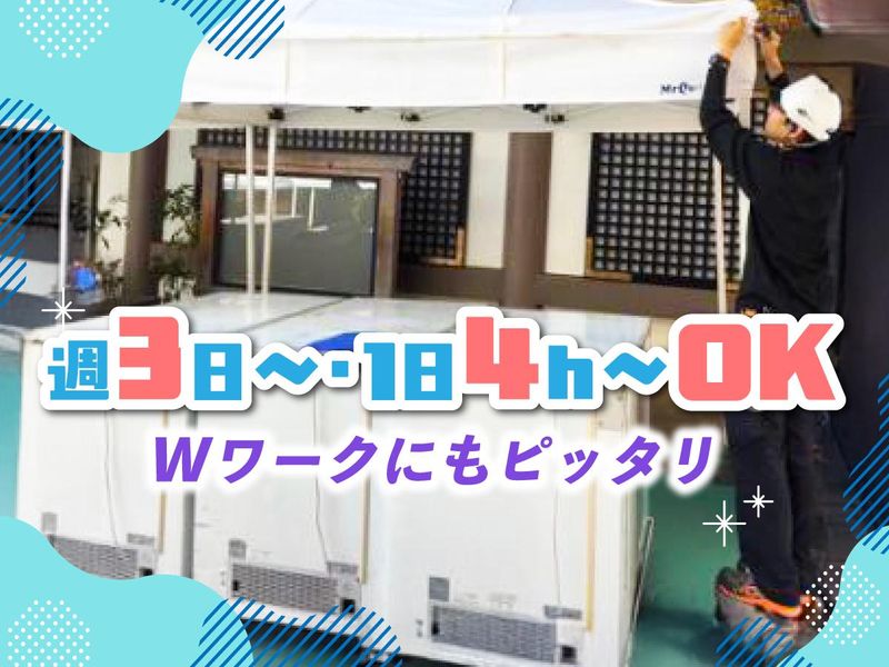 仕事内容 <ダスキンレントオールで新規スタッフ大募集!> <イベントの成功を“裏側”から支える仕事> ⭐この仕事ならではのやりがい⭐ 何もない広場に、数時間で巨大なステージができあがる達成感は格別! 自分が設営した会場で、子供たちが楽しそうにしている姿を見れるが何よりのやりがい! ⭐シフトの自由度が抜群!⭐ ◎週3日~/1日4h~OKの柔軟シフト♪ ◎フルタイムなら月収22万円以上可能。ガッツリ稼ぎたい方を応援します! ◎10時~14時など、お子さんの送り迎えに合わせた時短勤務も大歓迎! ◎授業がない日だけ、土日メインの勤務もOK! 音楽フェス・地域のお祭り・各種イベント―― その舞台裏で活躍するのが、私たちの仕事です。 誰もが知るダスキンブランドだから、 安定感も働きやすさも抜群! 【お仕事内容】 イベント運営を支える各種業務をお任せします。 チーム作業中心なので、体を動かすのが好きな方に最適! 重いものは2人で運びますのでご安心ください! 夏場は屋外での作業、冬場は倉庫内でのメンテナンスが中心です! 【具体的には…】 ✅イベント会場へのレンタル用品の回収 ✅テント・イス・ステージなどの設営/撤去 ✅お客様先での簡単なサポート業務 ✅倉庫内での商品管理、入出庫作業 ✅施工管理業務など 【関われるイベント例】 音楽フェス・地域イベント・お祭りなど、 さまざまな現場を経験できます! 【未経験でも安心の環境】 業務はマニュアル化されており、 スタッフ同士の協力体制も万全。 先輩が現場で丁寧にサポートするので、 初めての方でもスムーズに仕事を覚えられます。 【ダスキンレントオールとは?】 イベント用品のレンタル事業を展開する、 確かな実績と基盤を持つ安定企業。 全国規模のイベントから地域密着の催しまで、 幅広い現場を支えています。 【この仕事のポイント】 ⏩ 有名企業「ダスキン」で安心して働ける ⏩ 時給1400円~で短時間でも効率よく収入GET ⏩ 扶養内・Wワークも歓迎 ⏩ 車・バイク通勤OK(駐車場完備) ⏩ 未経験スタート多数!研修&フォロー体制充実 ⏩ イベントをやり切ったあとの達成感が魅力 ⏩ 車・バイク通勤OK!無料駐車場完備なので、雨の日も通勤ラクラク! ⏩ 自転車なら草加駅から6分程度です 一般建設業許可/第157234号 屋外広告業/都広(0)第4765号