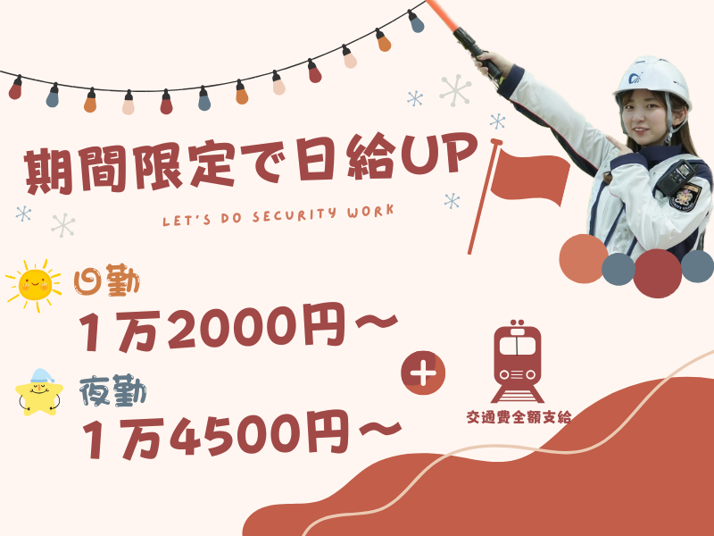 仕事内容 ☆★ 女子大生も ★☆ ☆★ 女性バイトも ★☆ ☆★ 主婦パートも ★☆ みんなが選んだレアバイト♪ 「もっと厳しいイメージだった」 という女性隊員Aさんも 無理なく、楽しく、働いています! (*’ω’).o0( なんで女性に人気なの? ) それは…!? こ~んなにメリットがあるから♪♪ ◆髪型、髪色、ネイル自由! ◆週3日~、土日休みOK! ◆日払いOKでスグ収入に! <日給UP!> ・日勤:日給1万2000円~ ・夜勤:日給1万4500円~ ▼▼ こんな方にも ▼▼ (>д<;) 週末はライブだ~! 仕事の予定入ったりしないかな? それにちょっと資金足りないカモ; →→ 土日休みOKだから、 思う存分ライブを楽しめます!! 1日1万円まで日払いOKで 急に推しのグッズが出たときも安心◎ (*'▽') ネイルは推しカラー♪ せっかく可愛くしたのに… 仕事のために落としたくない; →→ 好きなカラーのネイルOK!! 推しと一緒ならお仕事も頑張れる♪ また、髪色も自由でOKです◎ ★ミ ★ミ ★ミ ★ミ ★ミ <お仕事について> 建設現場、公共事業、下水道工事、 舗装工事、イベント警備などの現場で 車両を誘導し、 安全な通行をサポートします。 交通事故を未然に防ぐ、 社会貢献度の高いお仕事です。 「誘導ってどうやるの?」 「イメージできない」 そんな方でも大丈夫です! 警備の知識は一切なくてOK 入社後の研修や講習会を通じて ゼロから技術が身に付きますよ☆ ★ミ ★ミ ★ミ ★ミ ★ミ