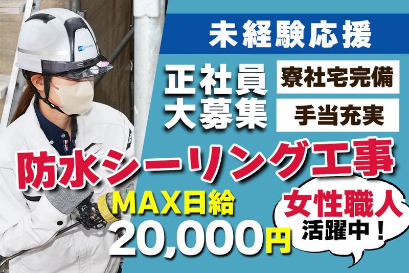 【アピールポイント】 成長企業で防水の建築スタッフを正社員募集! ※独立を希望される方限定※ ■未経験スタートOK ■月25万~50万 ■寮社宅あり ■マルチな技術身につく ■休み方選べる(週休2日OK)