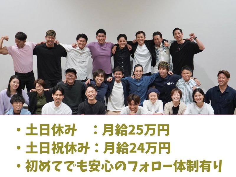 月給240,000円~250,000円 給与詳細 ※基本給・固定残業代の総額 基本給:月給 22万2000円 〜 23万1000円 固定残業代:あり 1ヶ月あたり1万8000円 〜 1万9000円(固定残業時間:1ヶ月あたり10時間) 固定残業時間を超えた勤務時間については別途残業代を支給する 【一律手当】 全員に一律で支払われる通勤・皆勤・家族手当金額:なし 全員に一律で支払われるその他手当金額:なし 交通費全額支給 賞与無し 昇給あり ※昇給は実績に応じて実施 選べる勤務形態 土日休み:月給25万円 土日祝休み:月給24万円