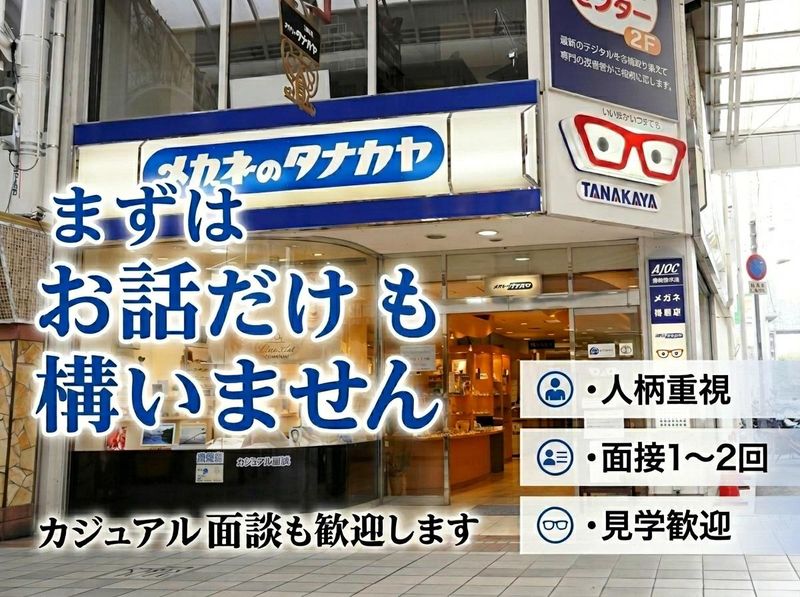 仕事内容 結婚・出産・介護を経て、もう一度接客の仕事に戻りたい。 でも「数字に追われる」「長時間労働」は、もう無理――。 そんな方にこそ、タナカヤの仕事は合うと思います。 ■ タナカヤとは 高松市・南新町商店街で84年続く老舗眼鏡店。 地元のお客様からの指名やご紹介が多く、 「売り込む」のではなく「一緒に選ぶ」接客が基本です。 ■ 仕事の中身 ─────────────────── 【接客・提案】 ・お客様へのヒアリング(視力・用途・生活スタイル) ・フレーム・レンズ選びのサポート ・フィッティング、顔立ちに合わせたアドバイス ・購入後のお礼状・お電話などアフターフォロー 【店舗運営】 ・眼鏡クリーニング、ディスプレイ整え ・商品整理、在庫確認 ・商品知識の学習(空き時間を活用) ・日報作成 ─────────────────── 眼鏡の専門知識は入社後に覚えればOKです。 研修あり・先輩スタッフがそばにいる環境で、 焦らず身につけていける体制があります。 ■ 1日の流れ 9:30 出勤・朝礼 10:00 開店・店内準備 11:00 接客対応 12:00 昼休憩 13:00 アフターフォロー(お礼状・お電話) 14:00 接客・商品整理・学習 17:00 翌日準備・日報 18:30 閉店・退勤 残業はほぼありません。定時退社が基本です。 ■ 評価と報酬 タナカヤでは「売上ノルマ」はありません。 評価されるのは: ・お客様の話をきちんと聞いているか ・生活に合った提案ができているか ・「またお願いしたい」と指名をもらえているか 固定給に加え、指名・リピートに連動した成果報酬があります。 【成果報酬の実例】 ─────────────────── 正社員Aさんの場合 月収:24万円 → 49万円(過去最大) 年収:370万円→420万円→500万円(今年着地予定) 非常勤Bさんの場合 月収:14万円 → 29万円(過去最大) 年収:194万円→223万円 ─────────────────── 固定給の安心感がありつつ、指名やリピートが増えれば 月収が倍近くになった実績もあります。 ■ 代表メッセージ 私たちが大切にしているのは、専門知識より 「目の前のお客様に誠実でありたい」という姿勢です。 まずはお話だけでも構いません。見学も歓迎します。